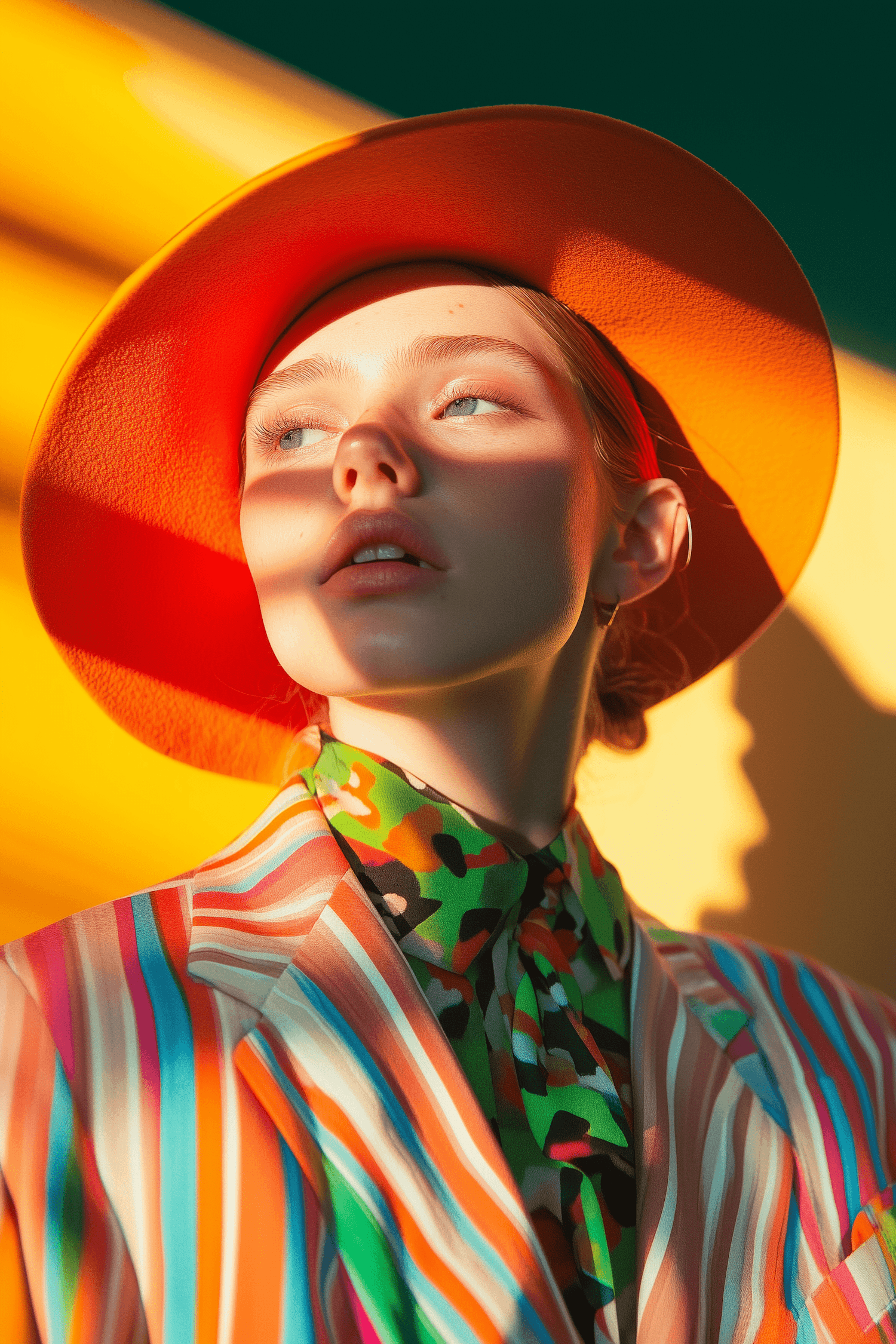 Vibrant portrait of a woman in a colorful outfit and orange hat, with dramatic lighting and shadows creating a striking visual effect.