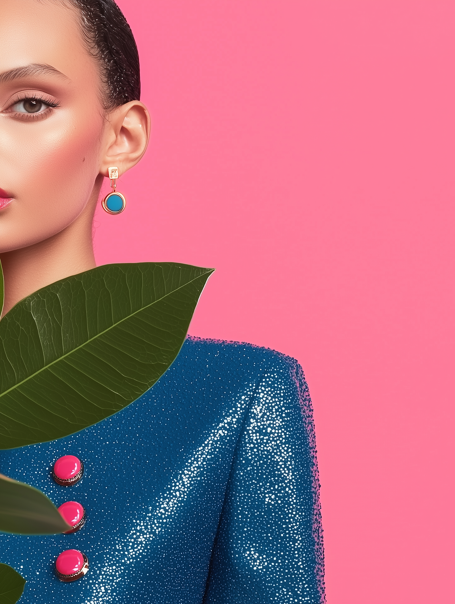 Stylish portrait with a sparkling blue outfit, pink buttons, and turquoise earring against a vibrant pink background and green leaf.