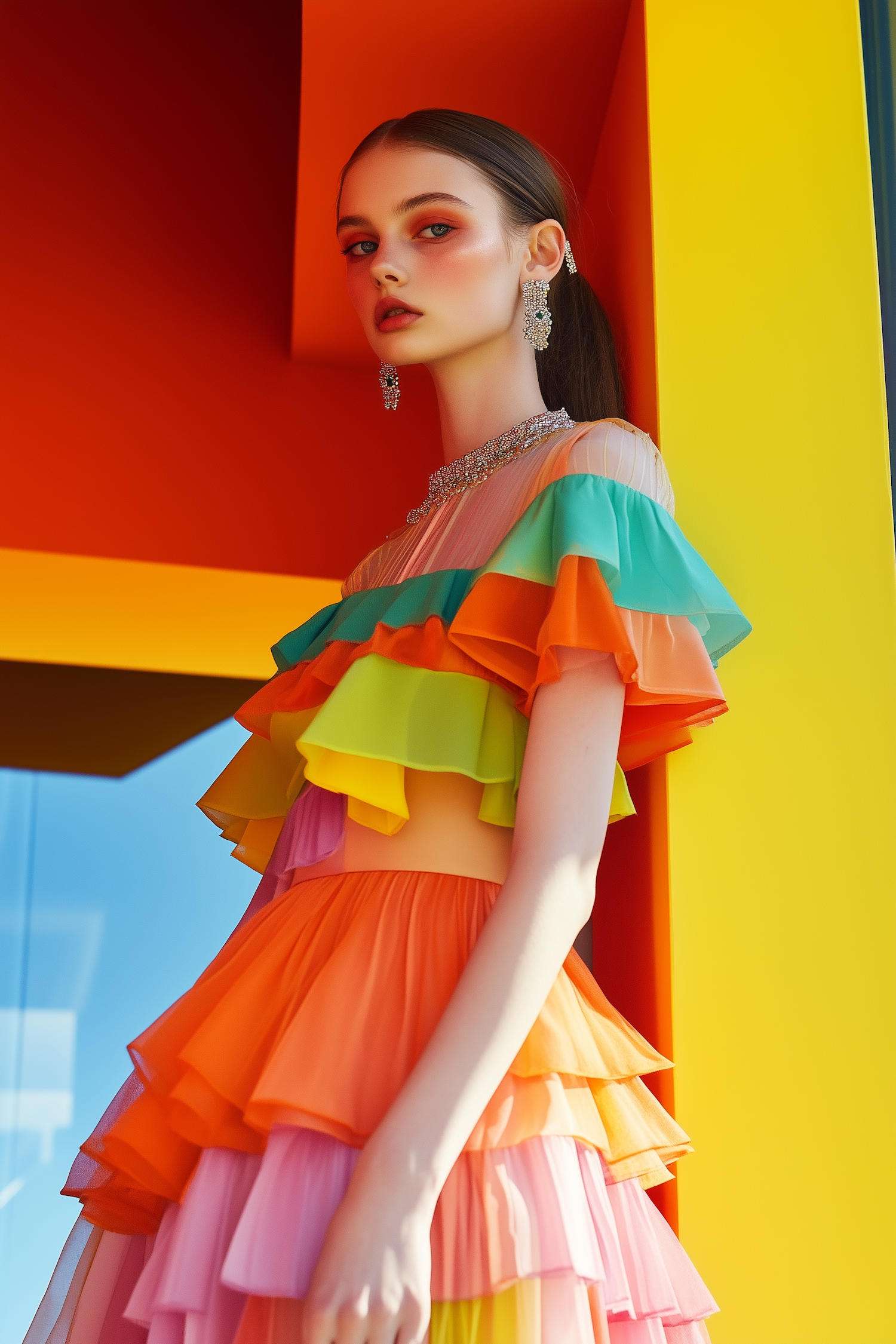 A vibrant portrait of a woman in a colorful ruffled dress, bold makeup, and sparkling jewelry against a geometric yellow-orange backdrop.