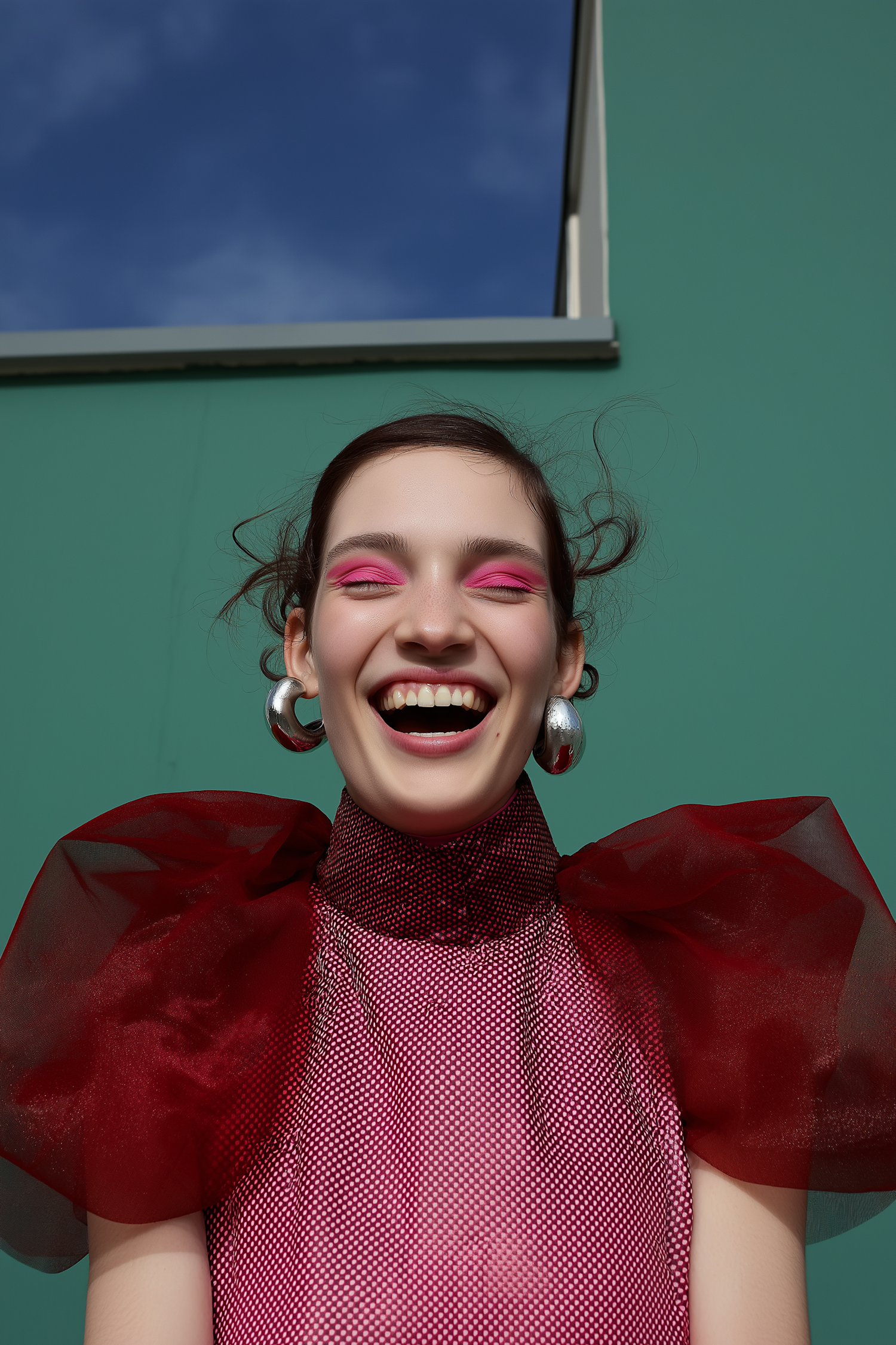 A cheerful woman in a bold red outfit with puffed sleeves and pink eyeshadow, set against a teal wall and blue sky background.