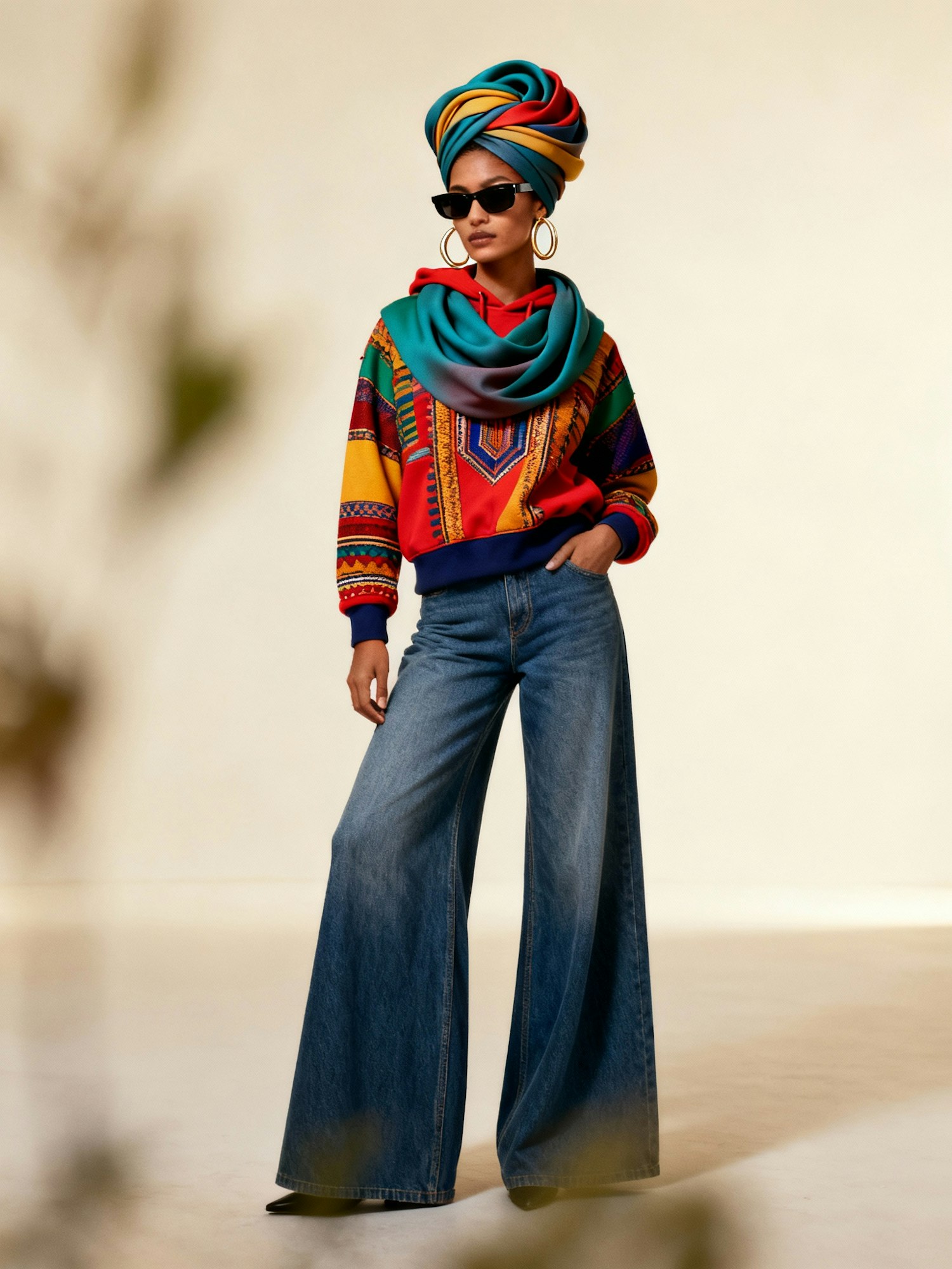 A vibrant outfit featuring a colorful hoodie, wide-leg jeans, and a stylish headwrap, accessorized with hoop earrings and sunglasses.
