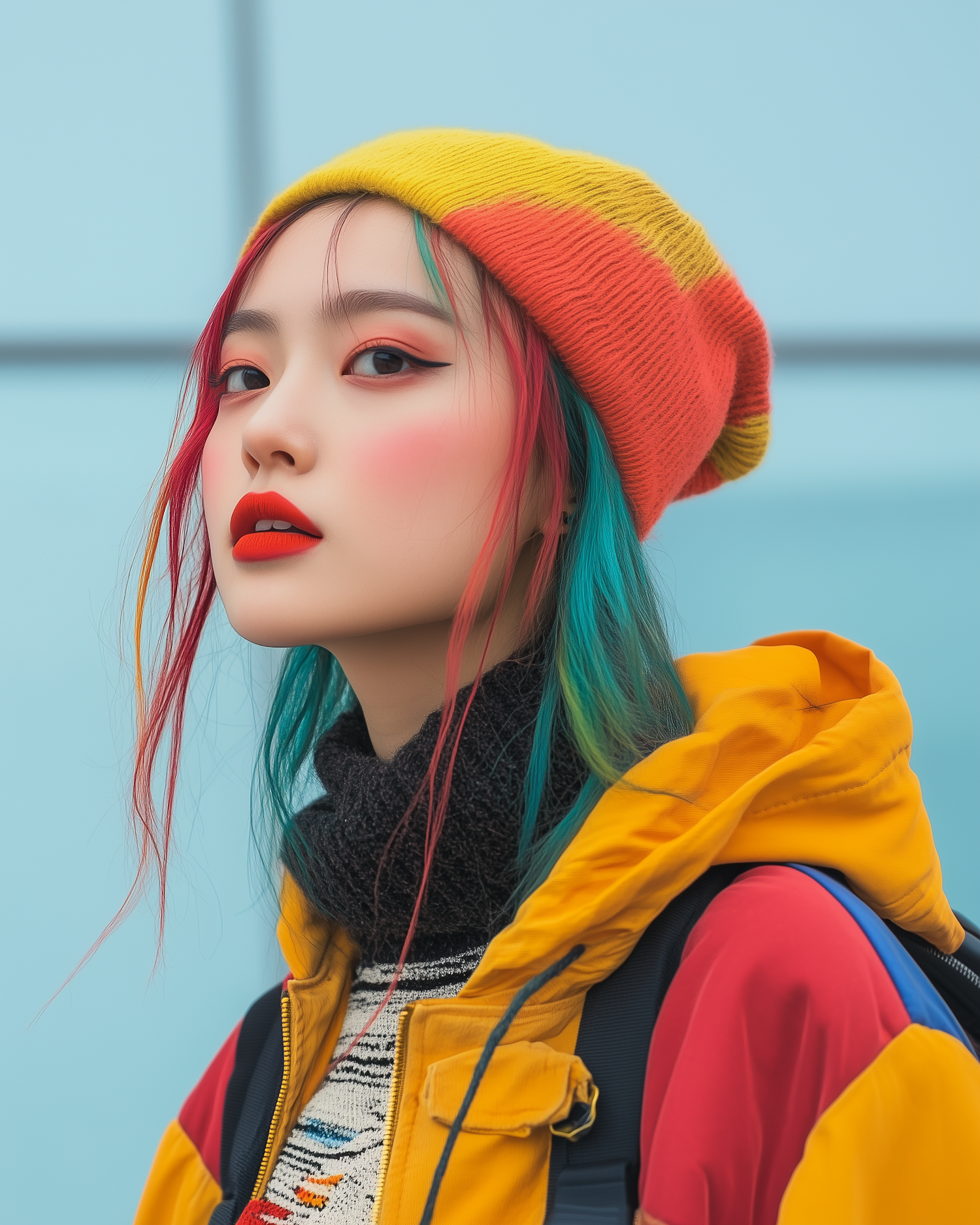 Vibrant portrait of a woman with colorful hair and bold fashion, featuring a yellow beanie and jacket against a blue background.