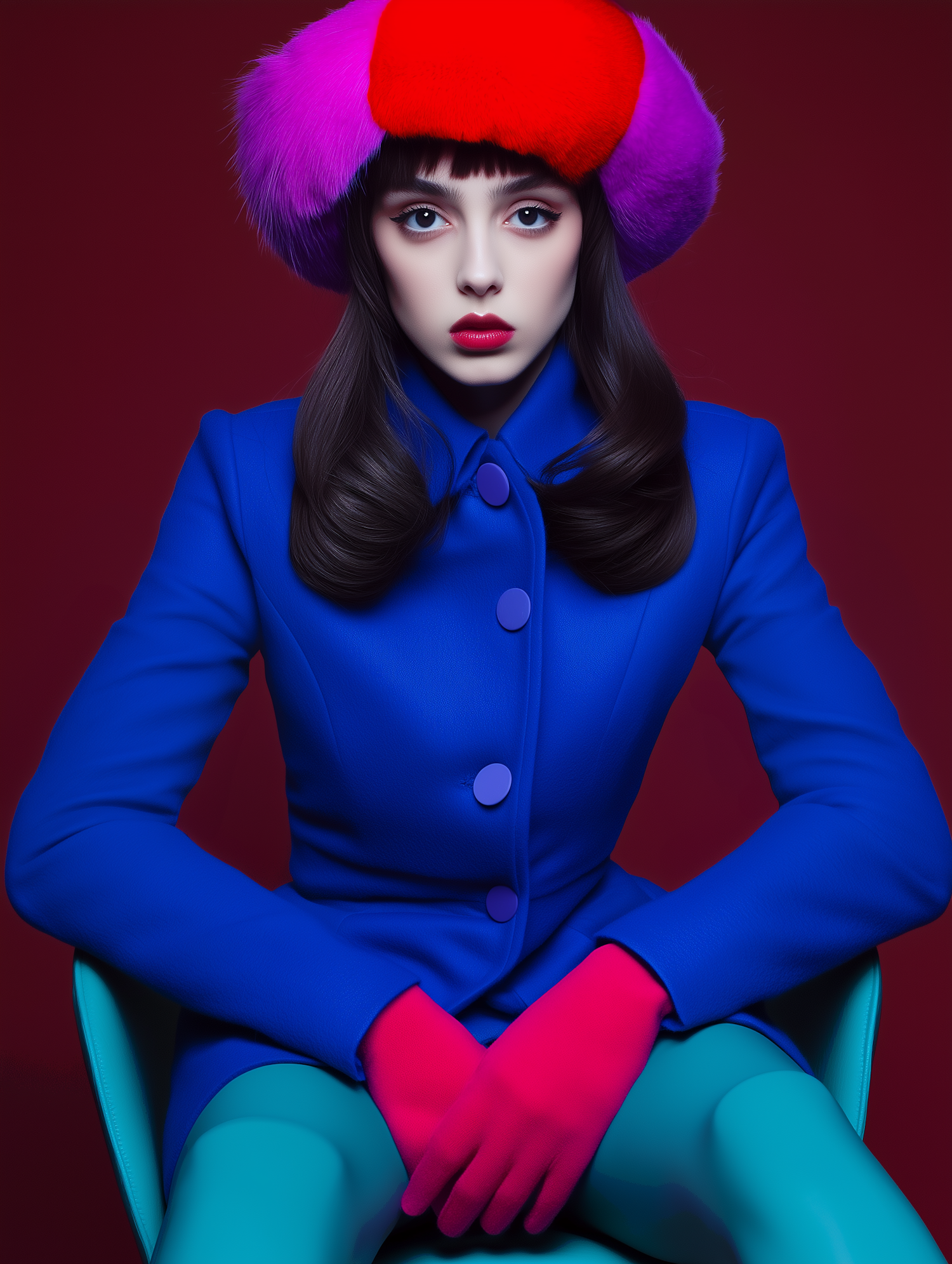 Stylish woman in a vibrant blue coat and colorful fur hat, set against a deep red background. Bold fashion statement with vivid colors.