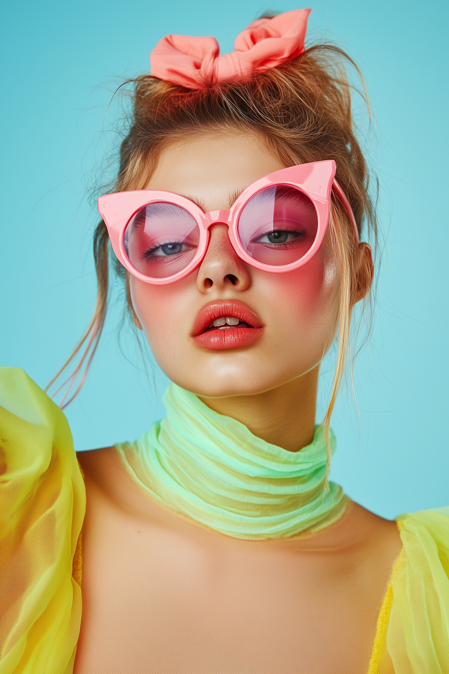 Vibrant portrait of a woman in pink cat-eye sunglasses, neon yellow and green outfit, and coral makeup against a turquoise background.