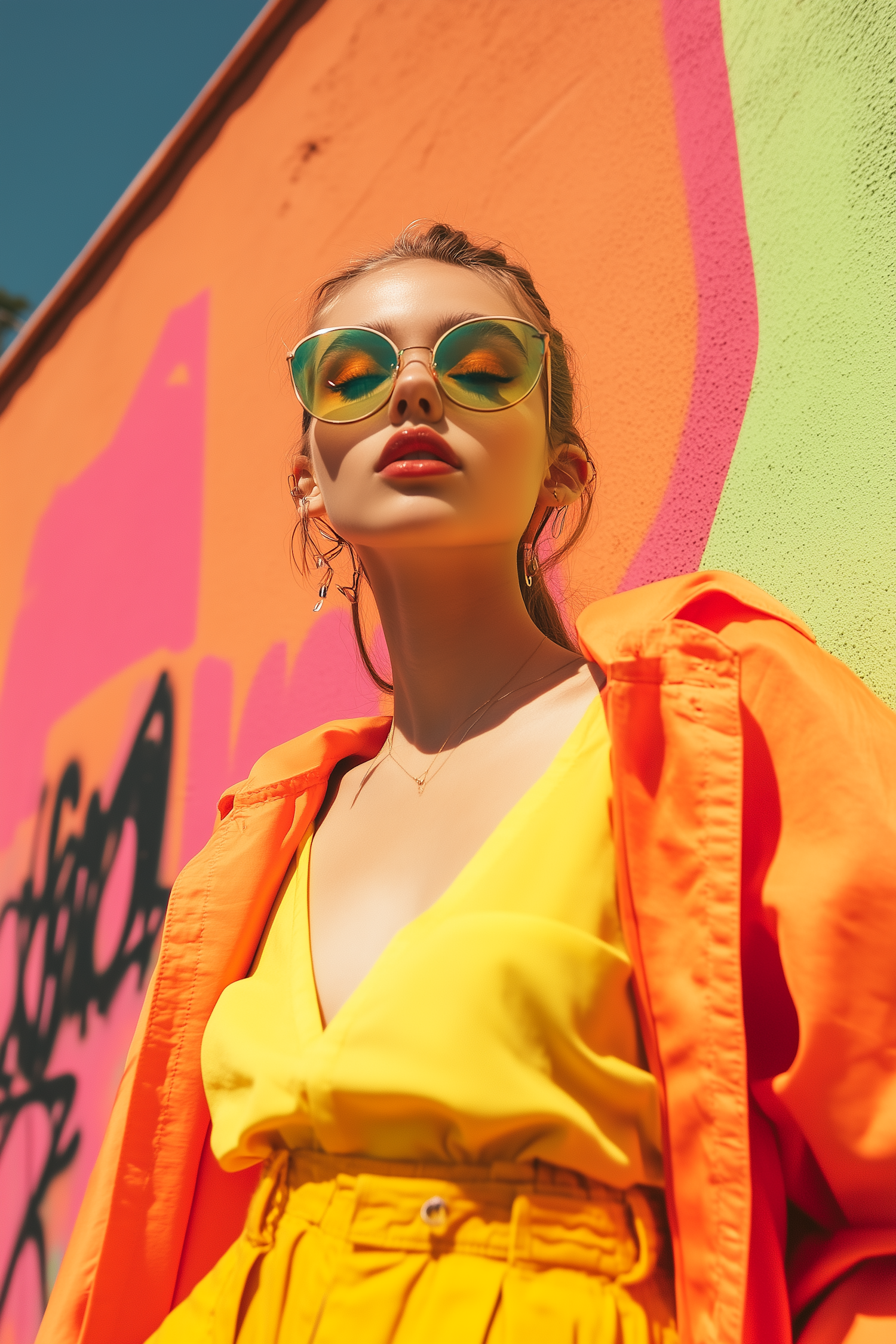 Stylish woman in bold yellow and orange outfit with reflective sunglasses, posing against a vibrant graffiti wall under bright sunlight.