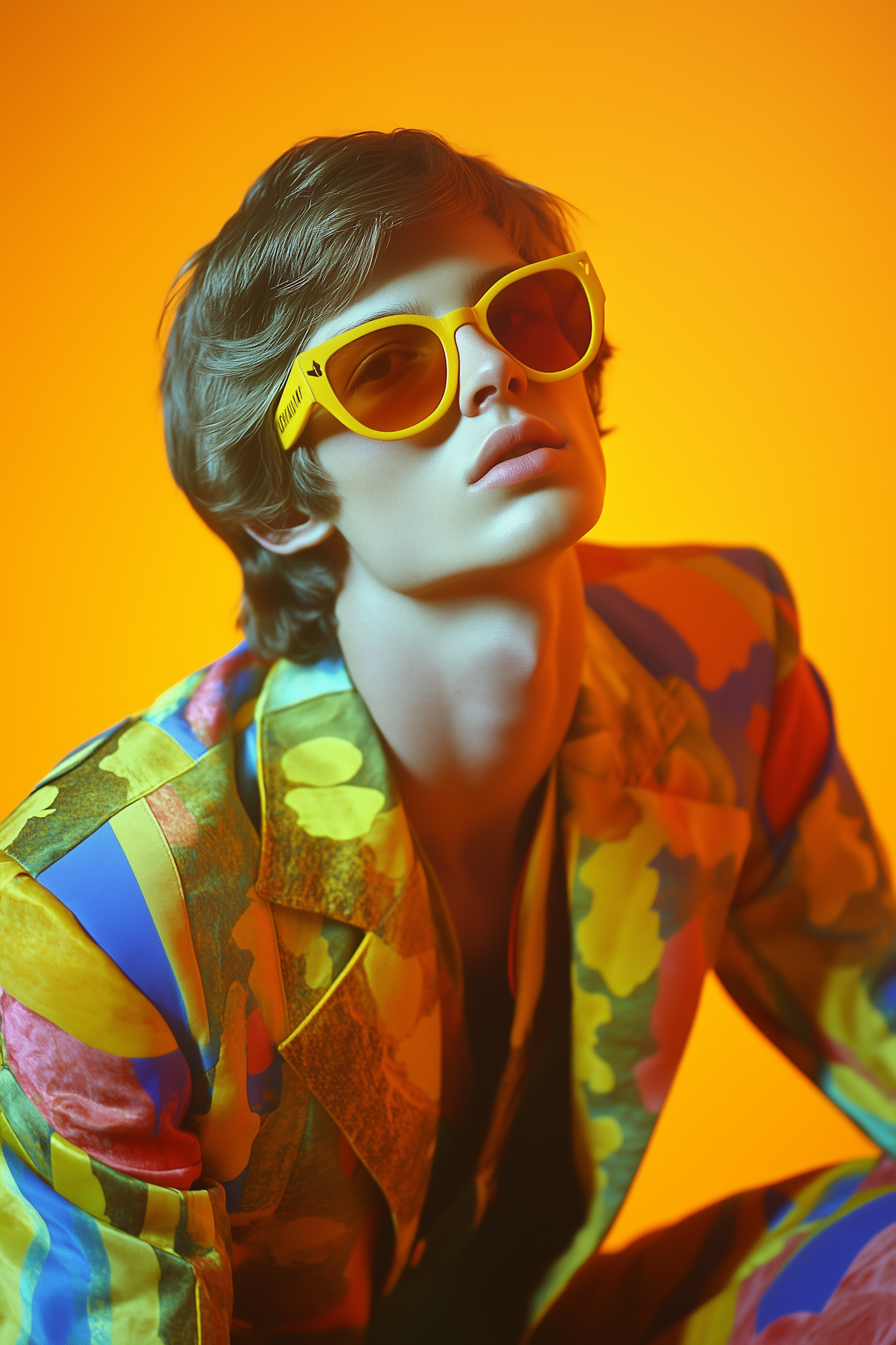 Stylish young man in vibrant patterned suit and yellow sunglasses against an orange backdrop, exuding modern fashion and coolness.