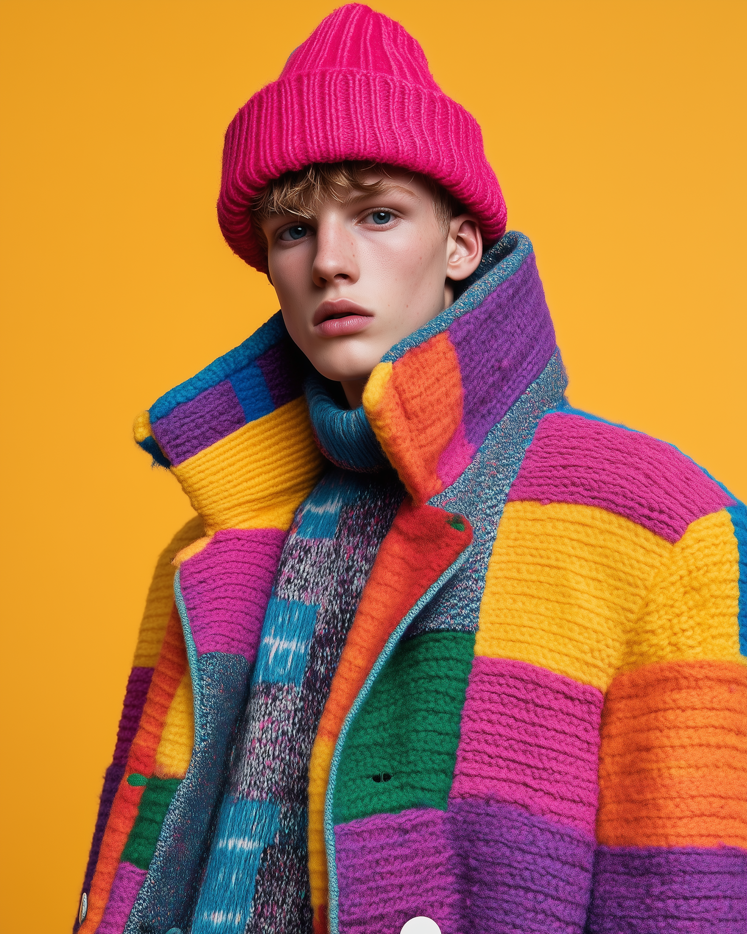 Young man in colorful patchwork coat and pink beanie against orange background, showcasing bold fashion and vibrant colors.