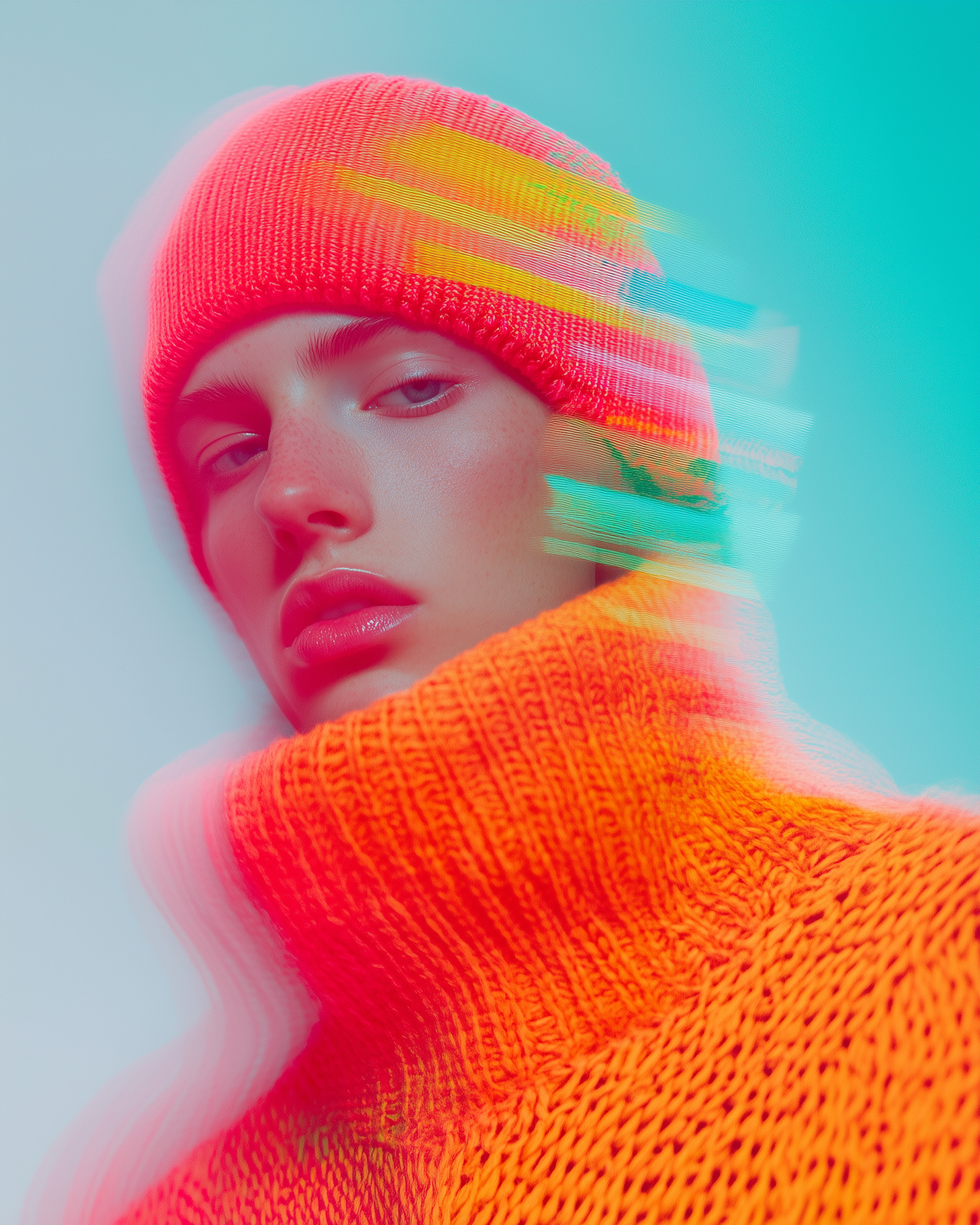 Vibrant portrait with surreal motion blur, featuring a person in bright orange knitwear against a teal background.