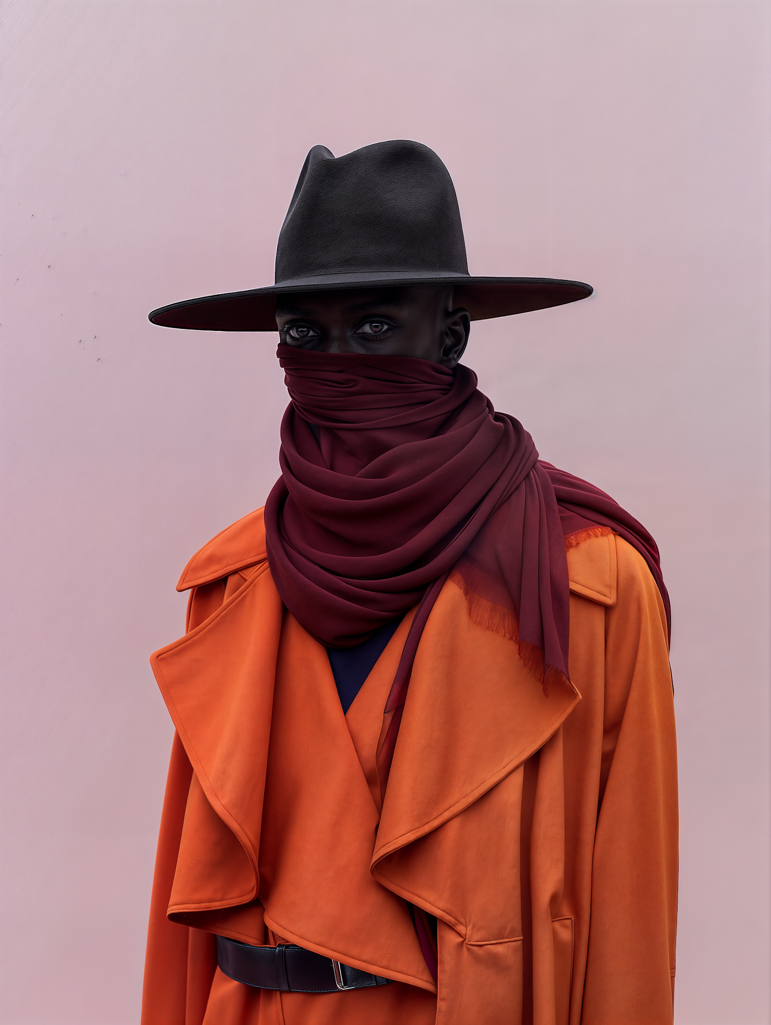 Mysterious figure in orange coat and burgundy scarf, wearing a black hat against a soft pink background.