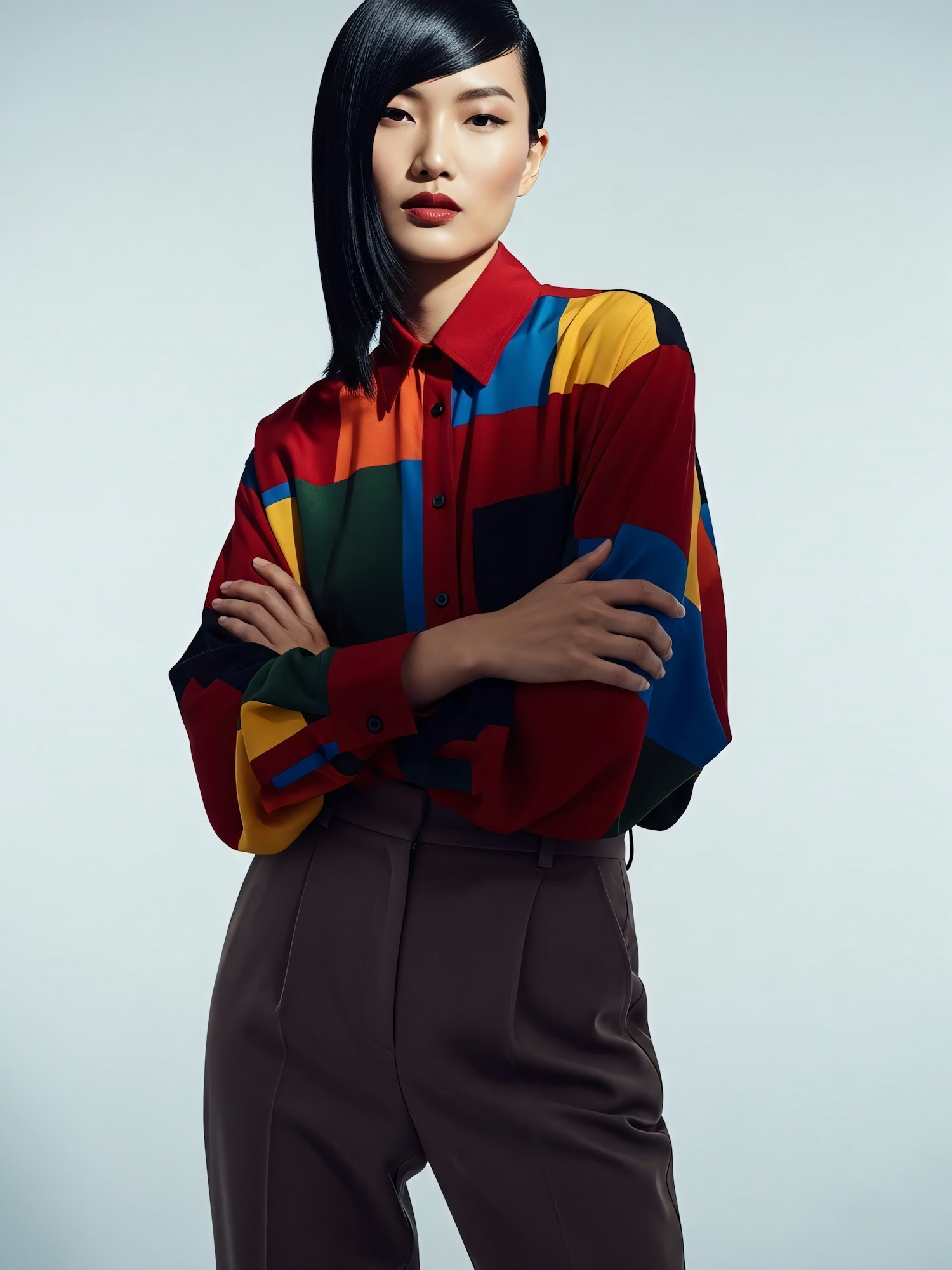 Stylish individual in a colorful geometric shirt and tailored trousers, posing confidently against a neutral background.