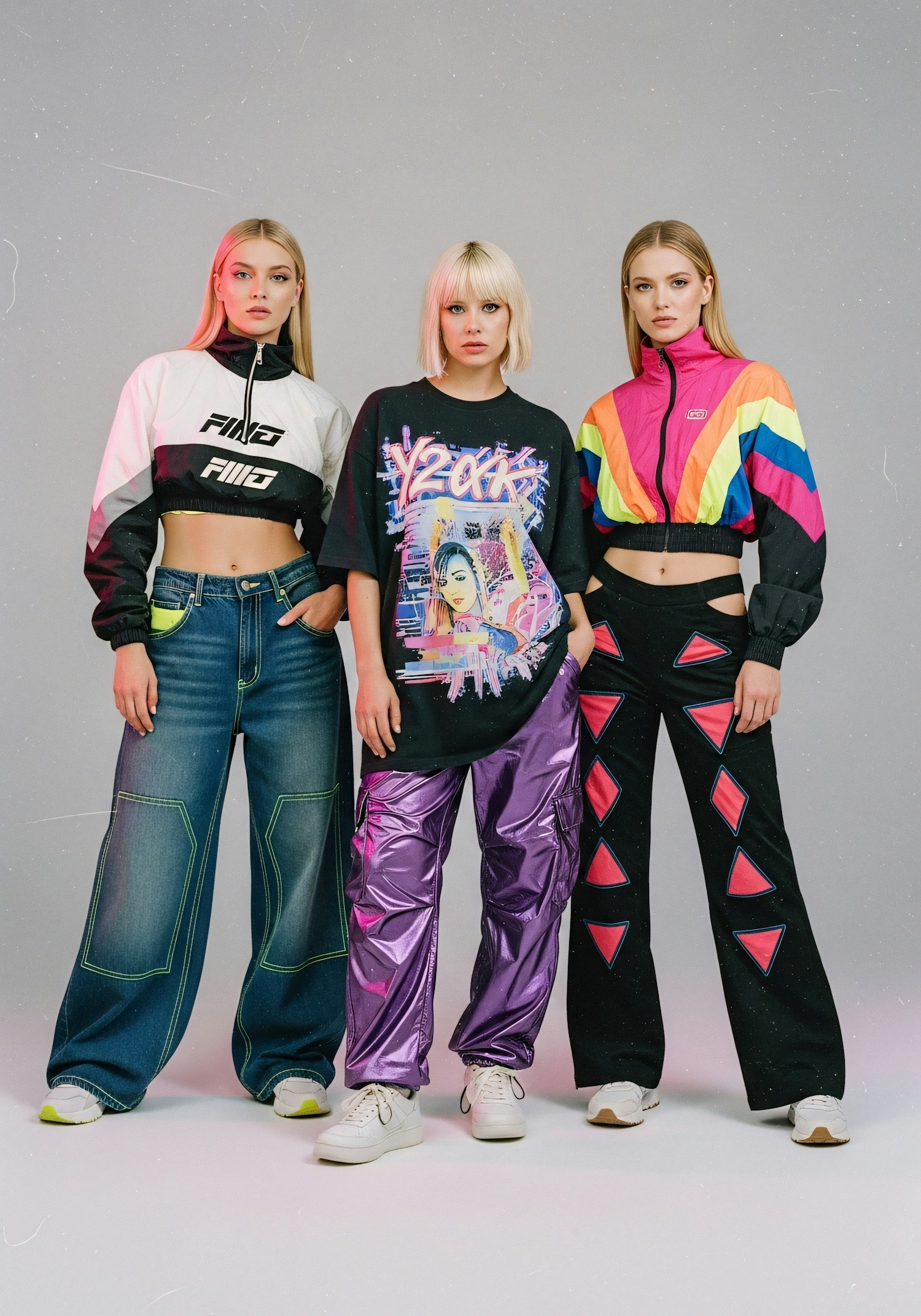 Three individuals in vibrant, retro-inspired outfits pose in a studio, showcasing bold colors and unique fashion styles.