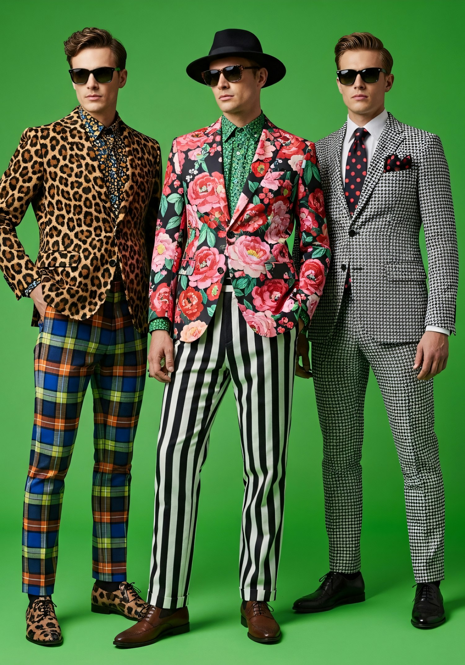 Three stylish individuals in bold patterned suits pose confidently against a green background, showcasing unique fashion choices.