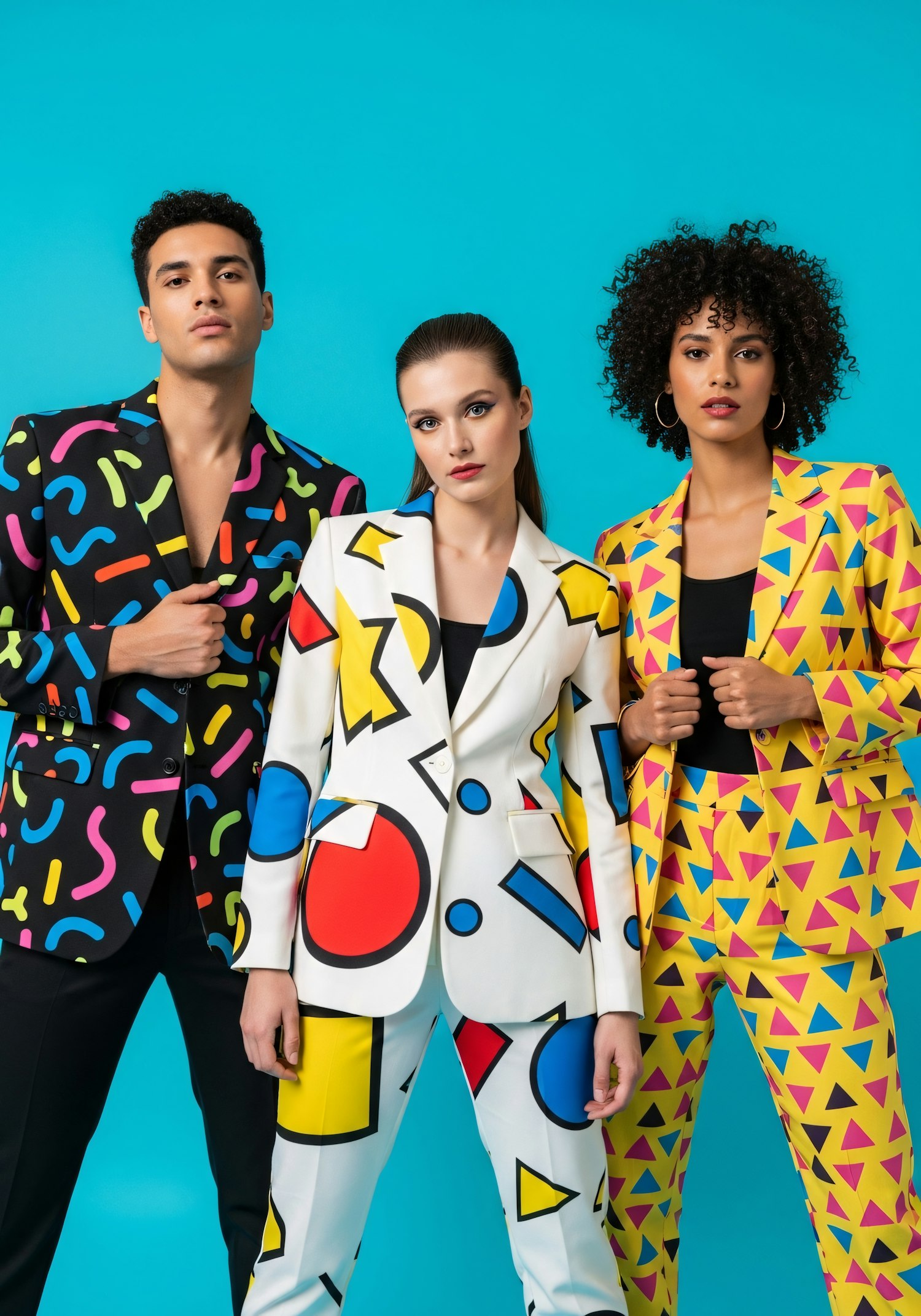 Three stylish individuals in vibrant, geometric-patterned suits pose confidently against a bright blue background.