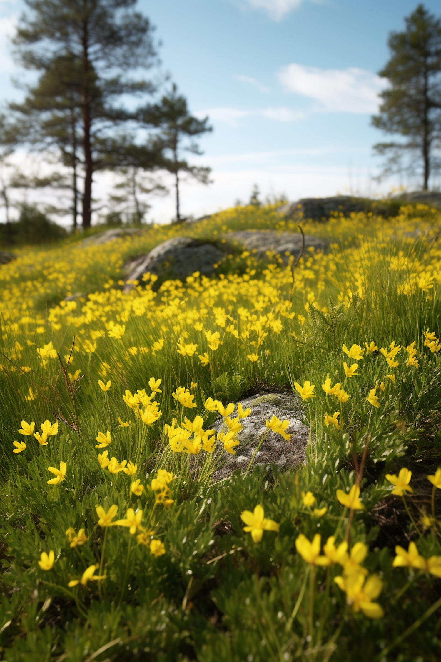 Vibrant yellow wildflowers in a lush meadow with pine trees and rocks under a clear blue sky, capturing a serene natural landscape.