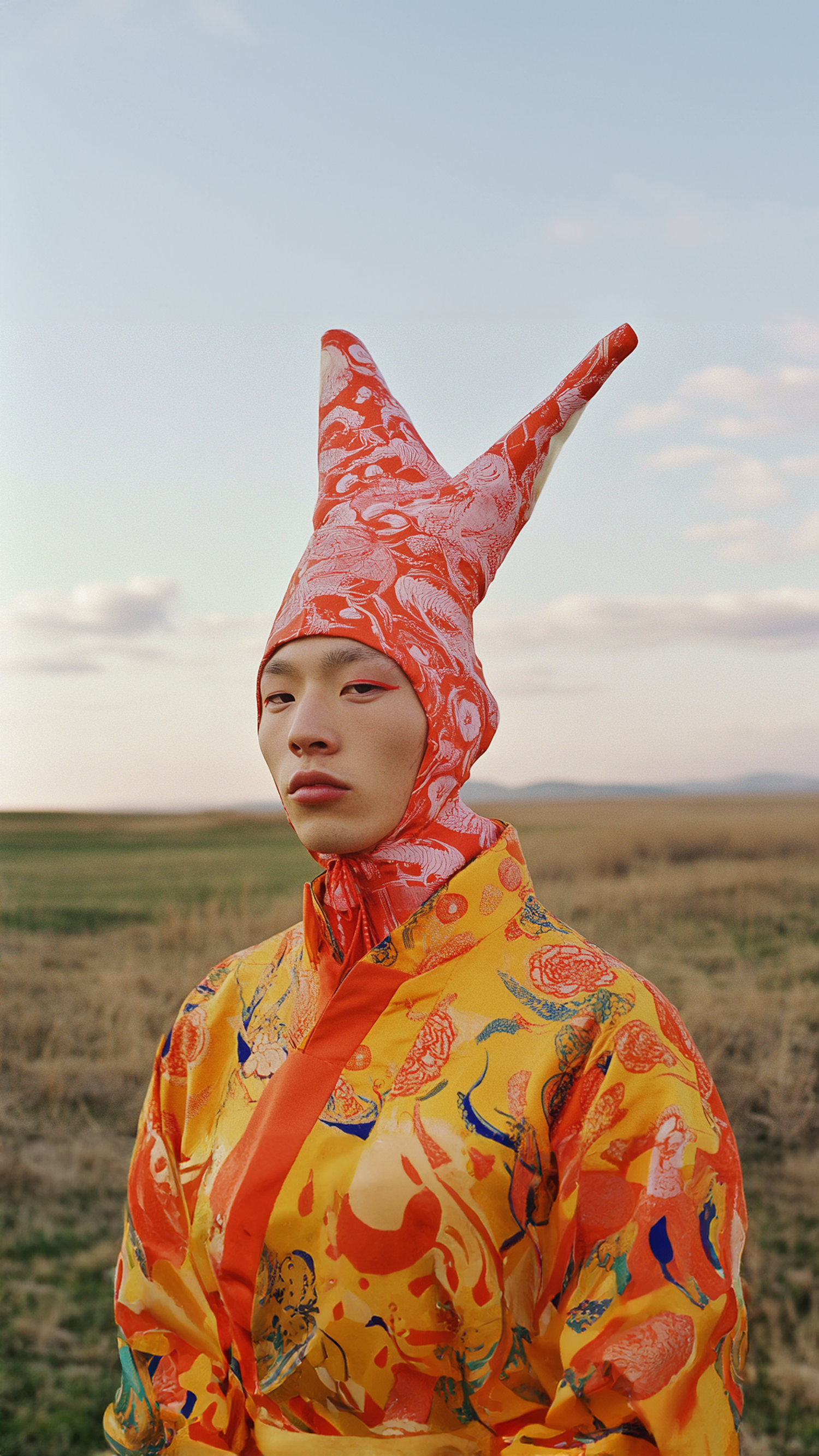 A person in a vibrant yellow and red patterned outfit with a unique headpiece stands in a serene open field under a clear sky.