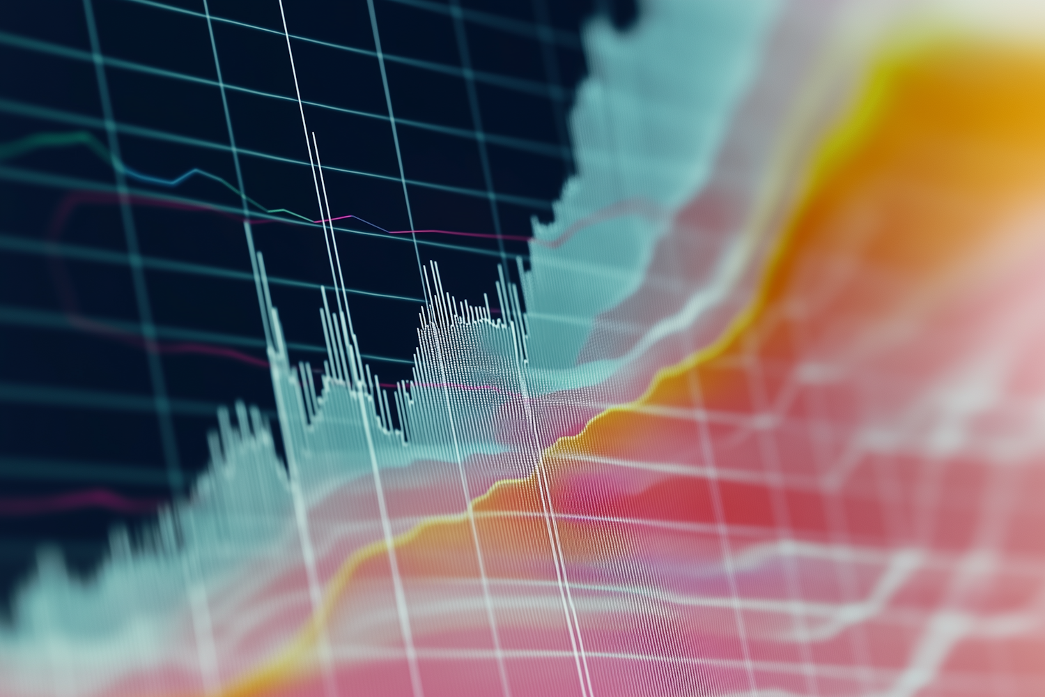 Vibrant financial graph with colorful data lines and bars on a dark background, showcasing dynamic trends and fluctuations.