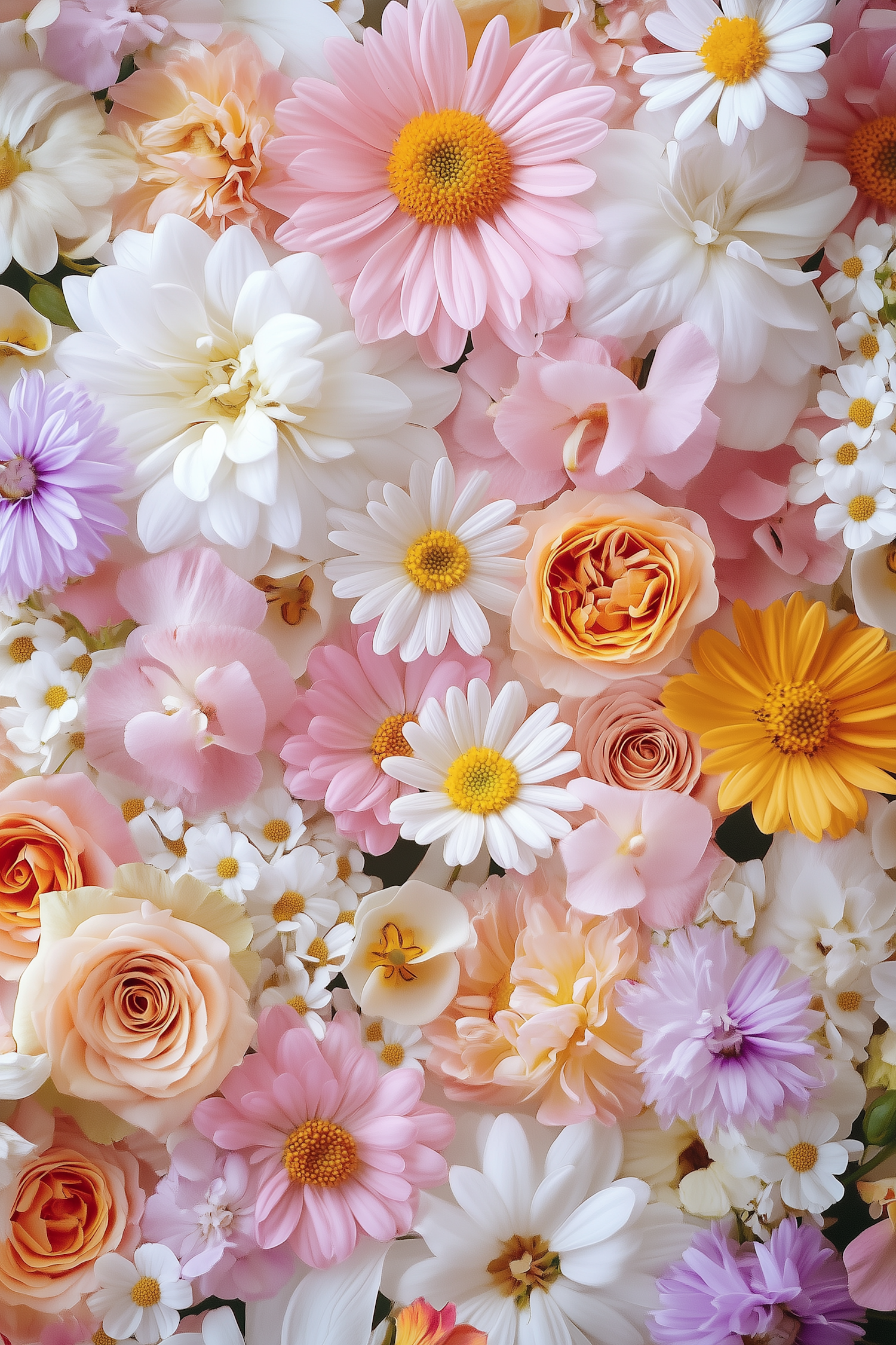 A vibrant floral arrangement with pink daisies, white daisies, peach roses, and purple flowers, creating a colorful and fresh display.