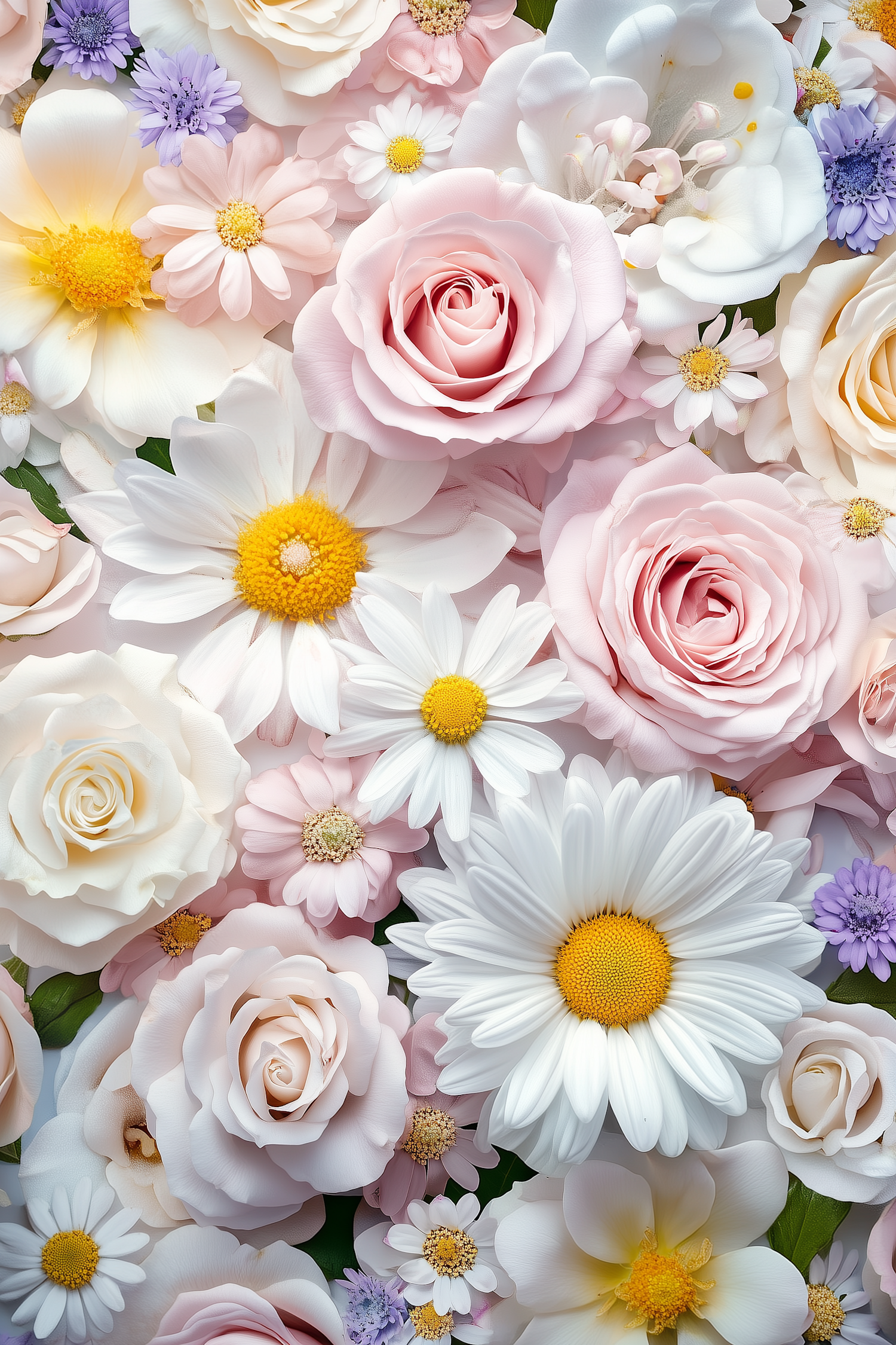A lush floral arrangement with pink roses, white daisies, and lavender blooms, creating a soft and harmonious pastel palette.