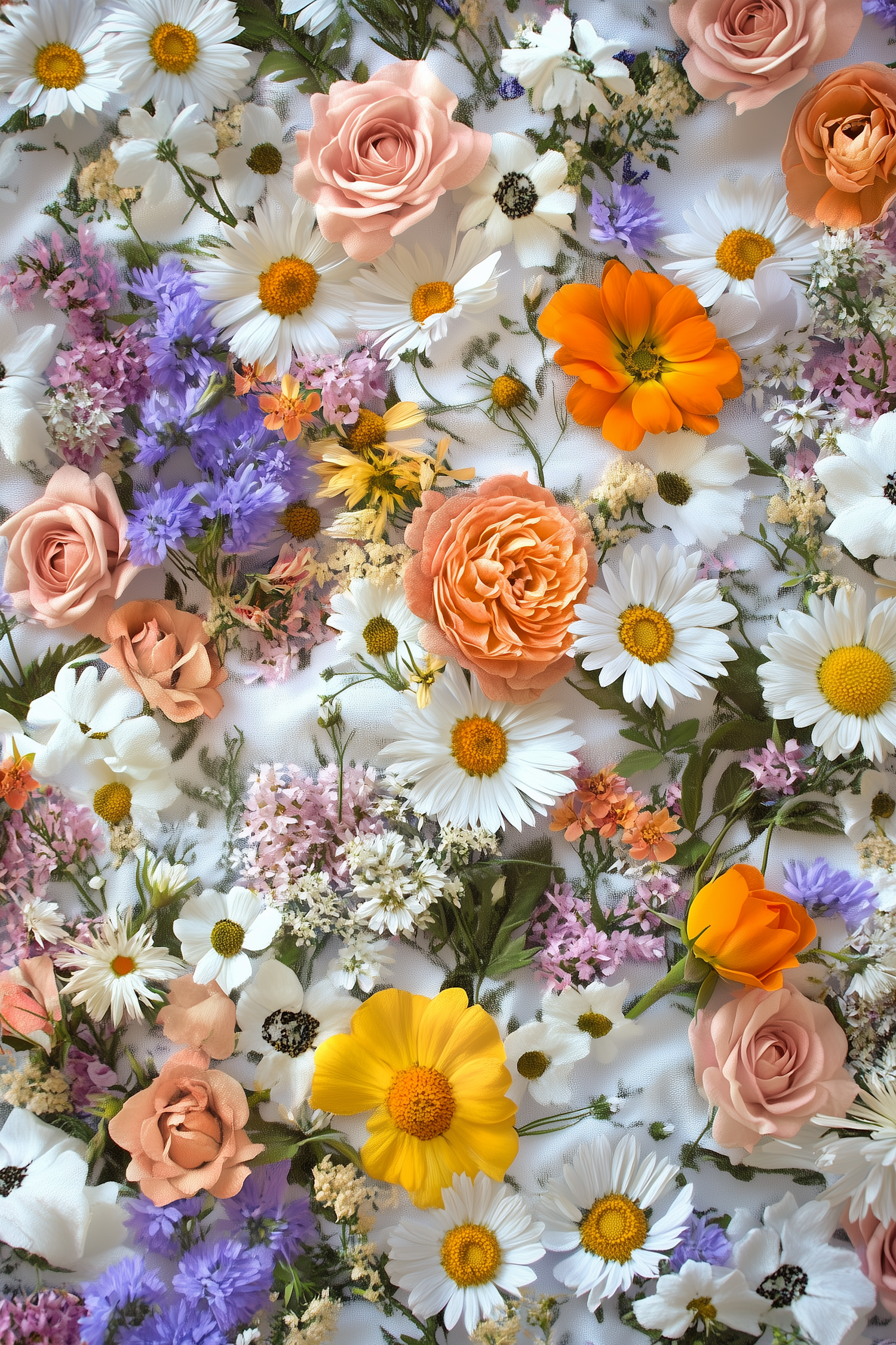 A vibrant floral arrangement with pink roses, orange marigolds, and white daisies, creating a lush and colorful display.