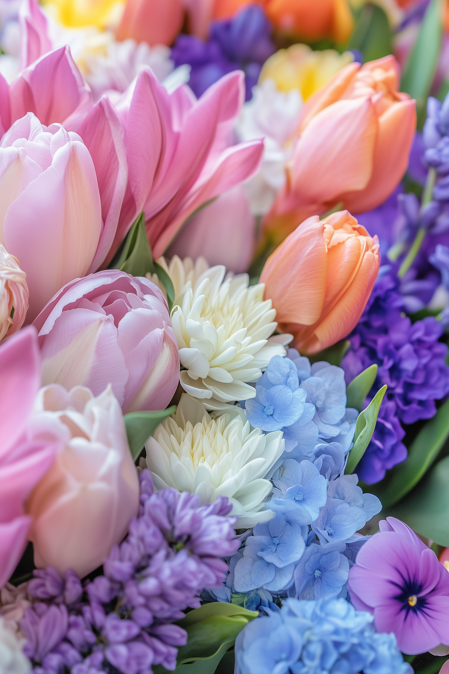 A vibrant bouquet of pink tulips, orange tulips, white chrysanthemums, blue hydrangeas, and purple hyacinths.