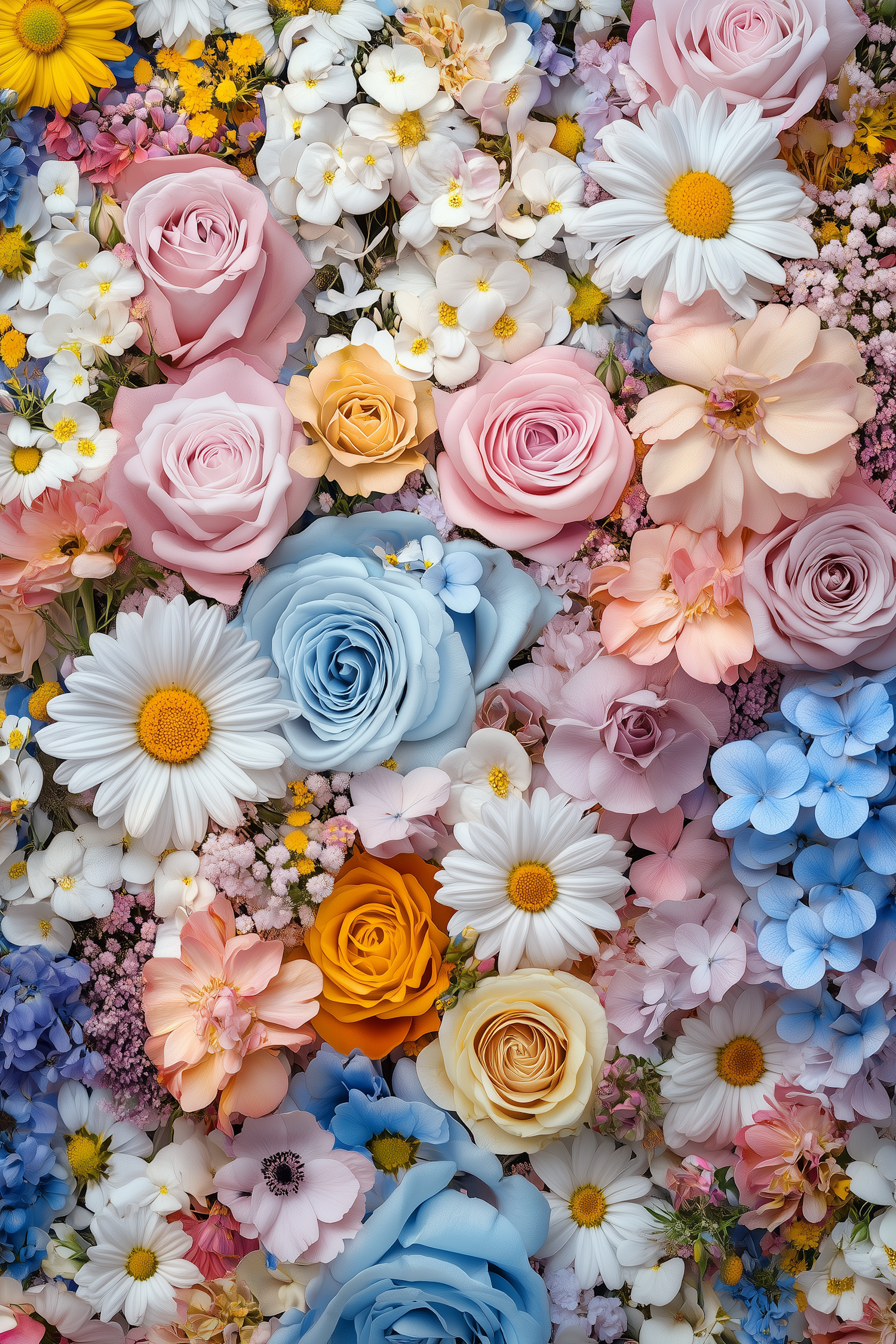 A vibrant floral arrangement with pink and blue roses, white daisies, and colorful blooms in a lush, eye-catching display.