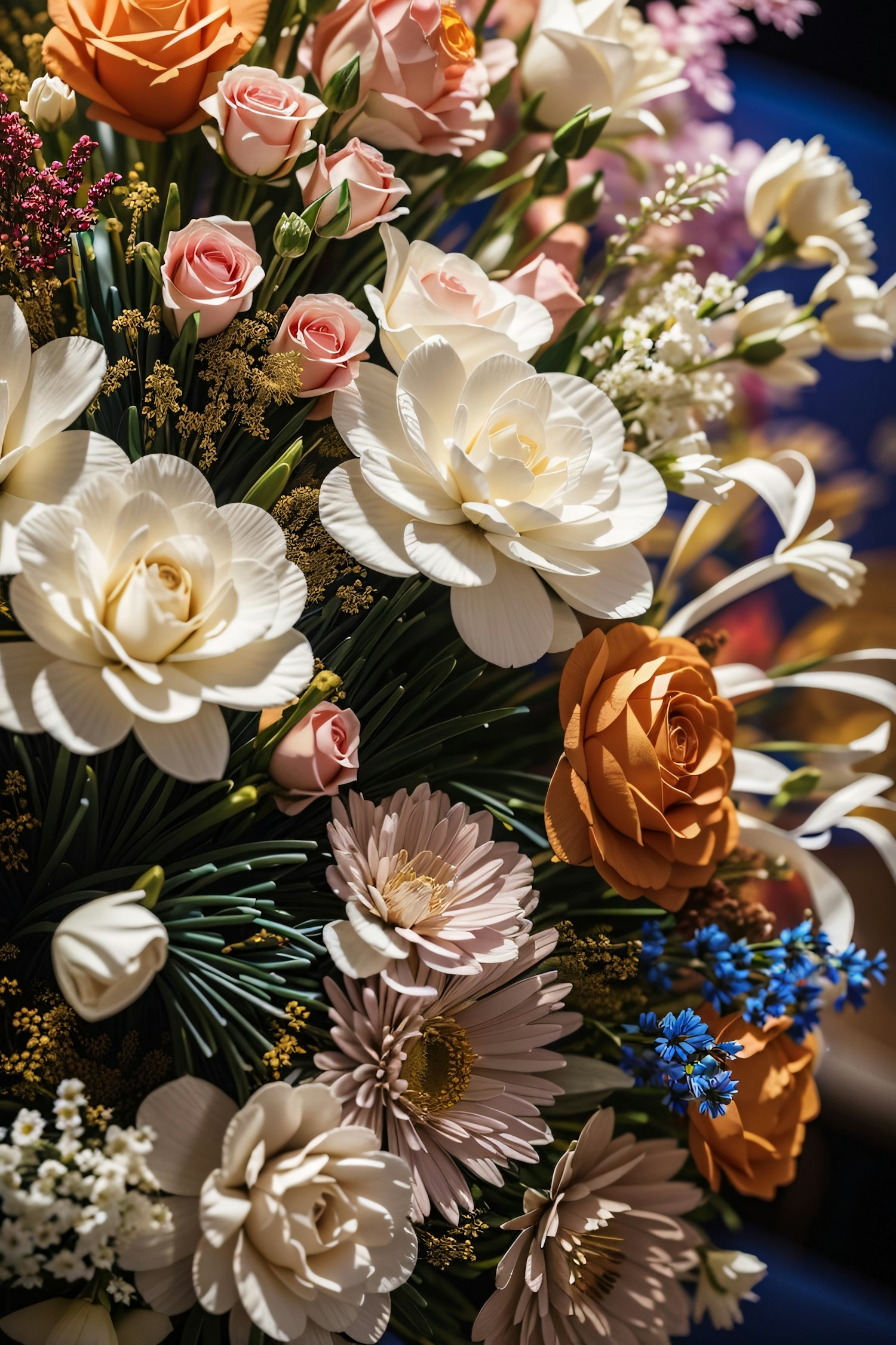 Elegant bouquet with white, pink, and orange roses, pale pink daisies, and blue flowers, creating a vibrant floral arrangement.