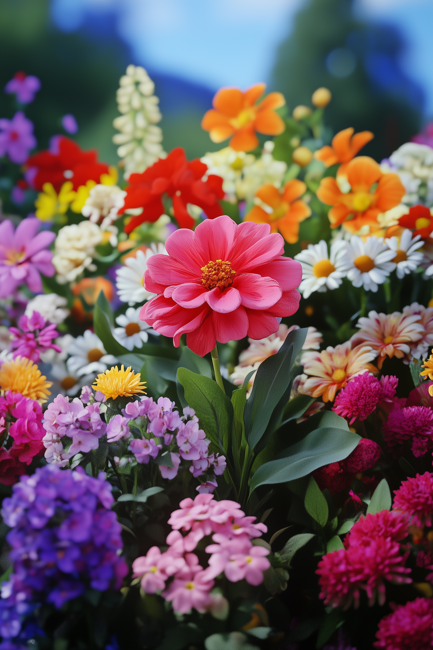 A vibrant garden with colorful flowers including pink, orange, and purple blooms, set against a lush green and blue backdrop.