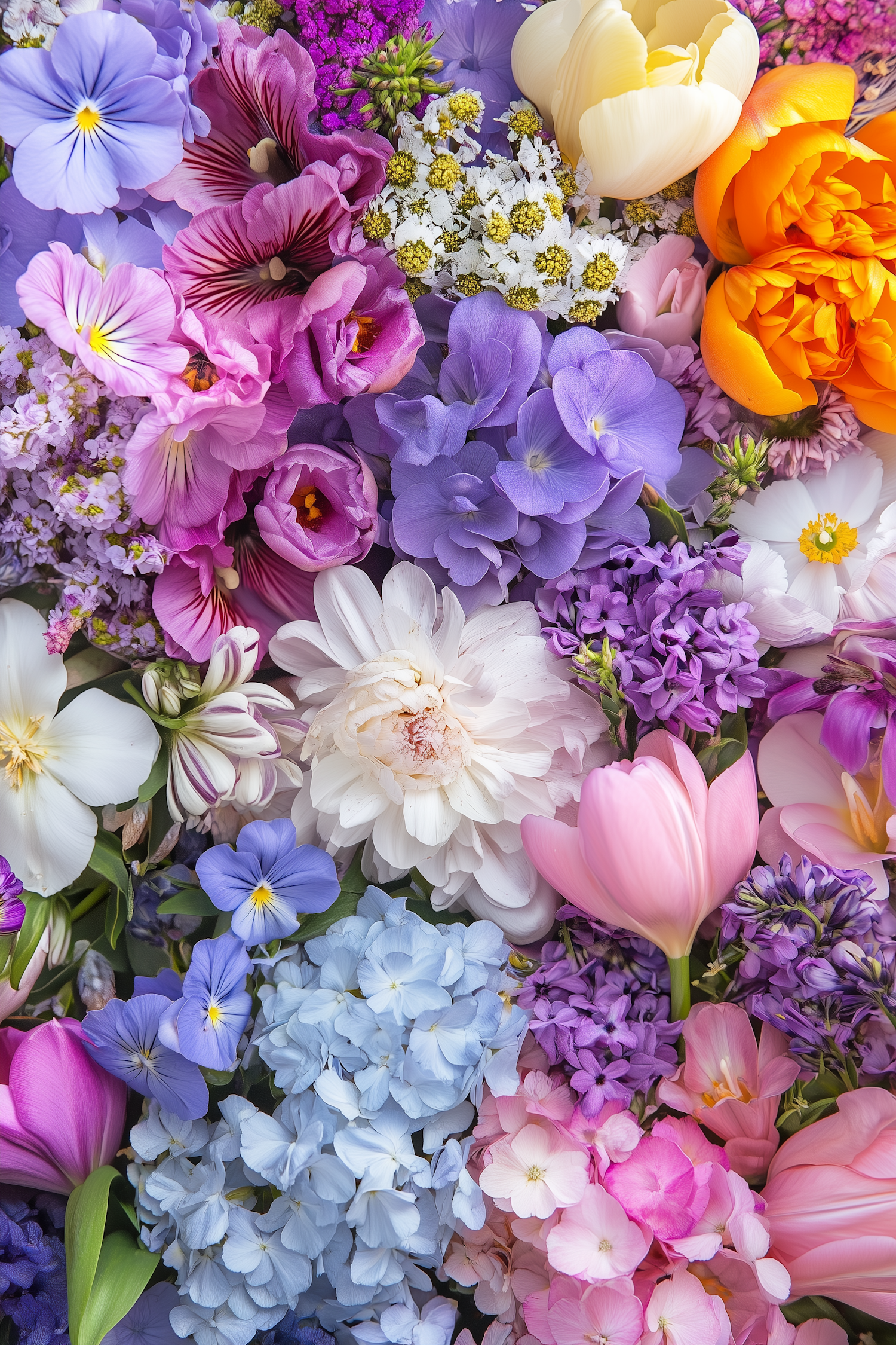 A vibrant floral arrangement with pansies, petunias, peonies, and tulips in a colorful mix of blues, pinks, oranges, and whites.