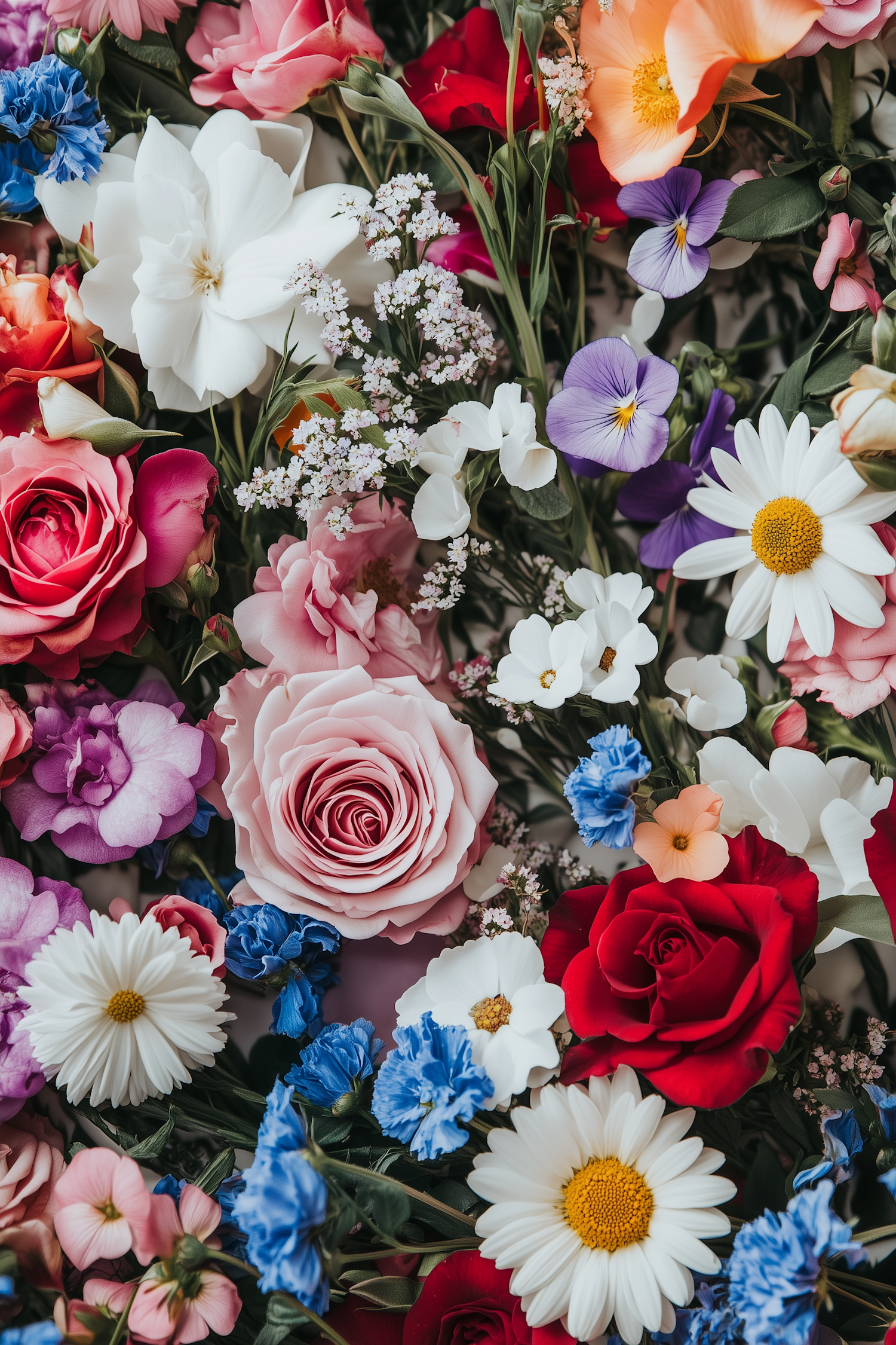 A vibrant floral arrangement with pink and red roses, white daisies, blue cornflowers, and lush greenery.