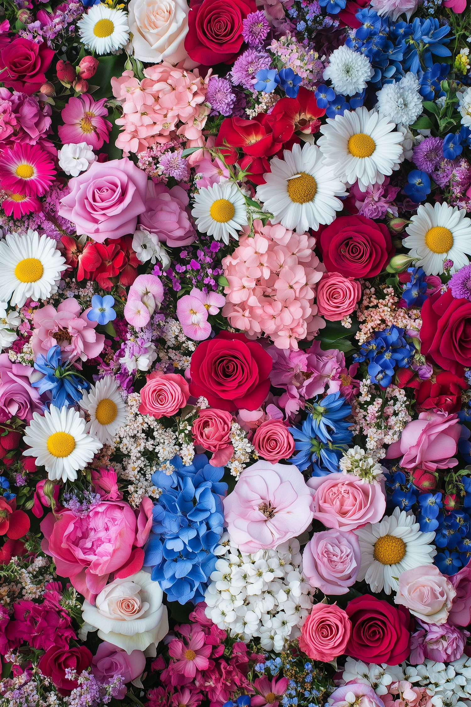 A vibrant floral arrangement with red roses, daisies, and hydrangeas in pink, white, and blue hues, creating a lush and colorful display.