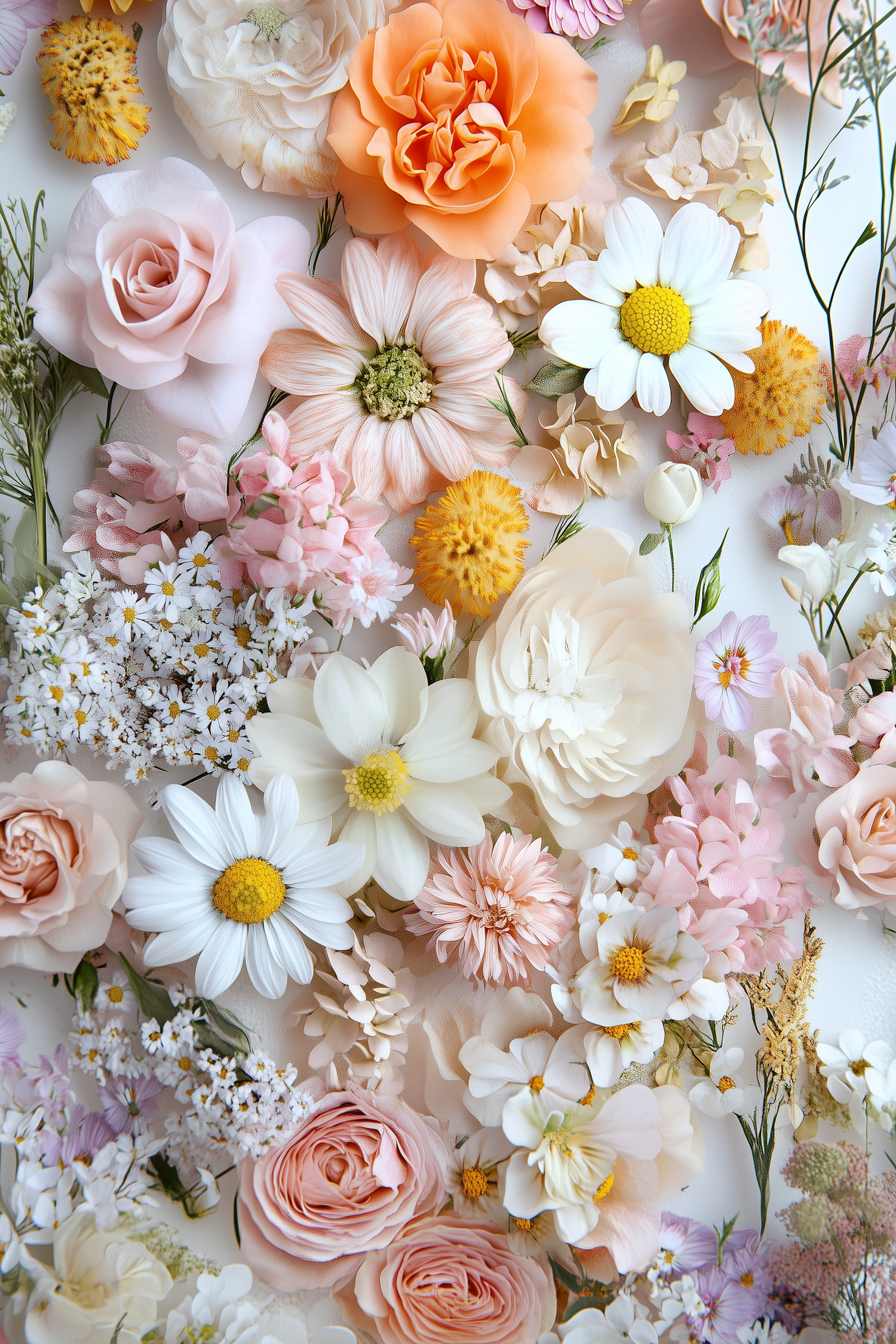A stunning floral arrangement with roses, daisies, and more in pink, white, yellow, and orange hues, creating a vibrant and lush display.