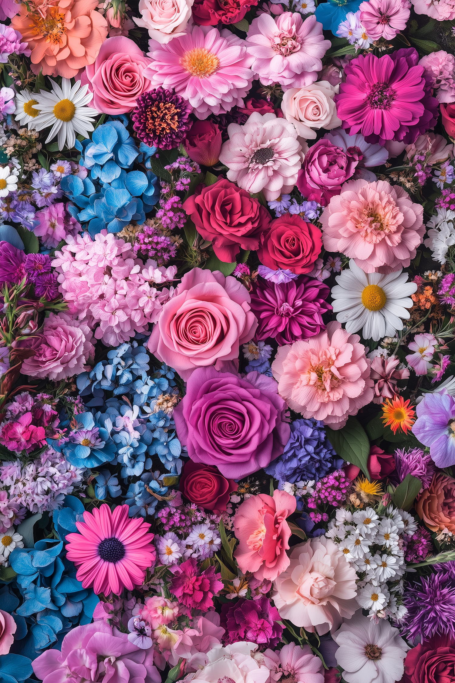 A vibrant floral arrangement with roses, daisies, and hydrangeas in pink, purple, blue, and white hues, creating a lush, colorful display.