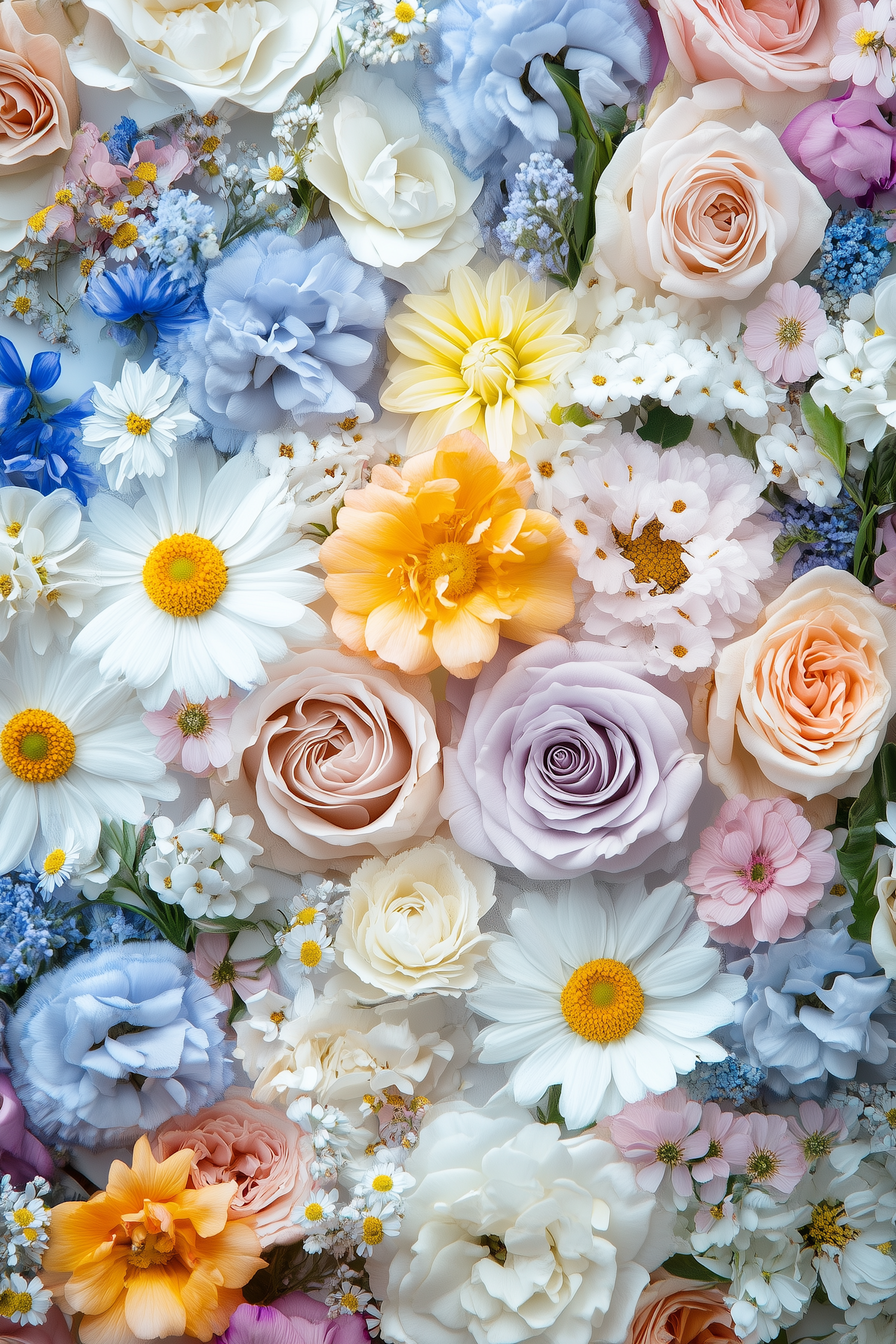 A vibrant floral arrangement with roses, daisies, and peonies in pastel and bright colors, creating a lush and fresh springtime feel.