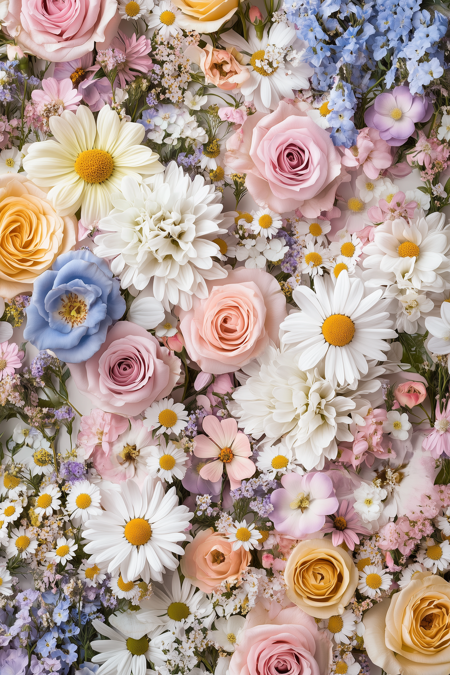 A lush floral arrangement with white daisies, pink roses, and blue flowers, creating a vibrant and harmonious tapestry of colors.