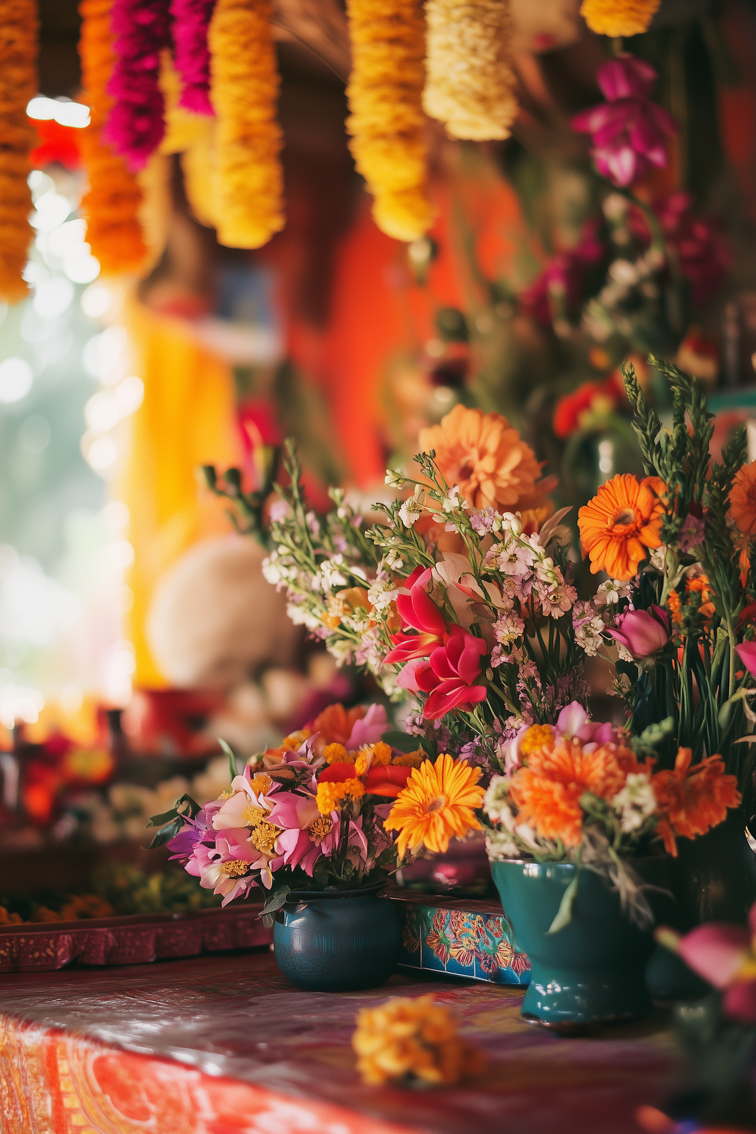 Vibrant floral arrangement with colorful flowers and marigold garlands, creating a festive and lively atmosphere.