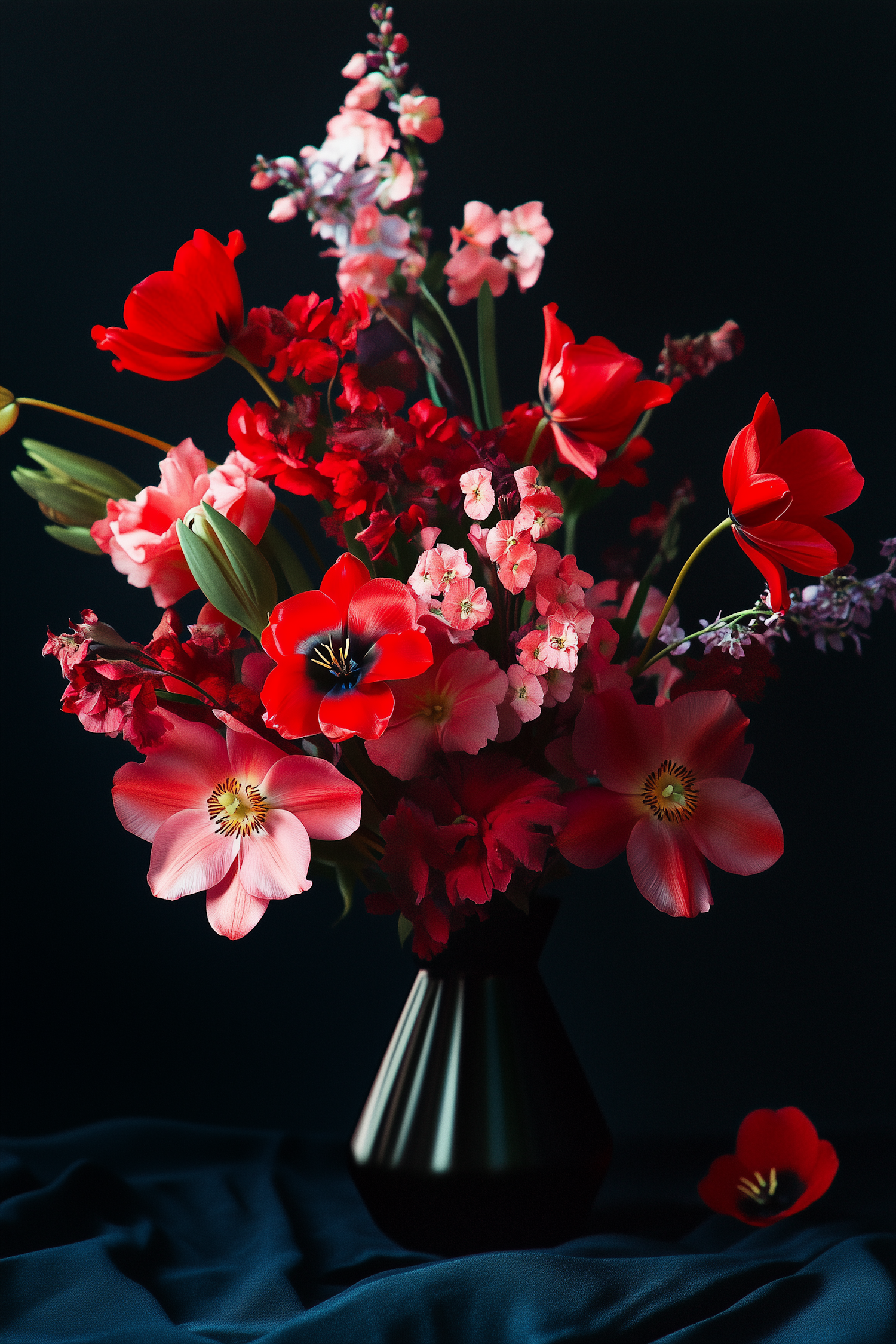 A stunning bouquet of red and pink flowers in a black vase, set against a dark background with a single flower on blue fabric.