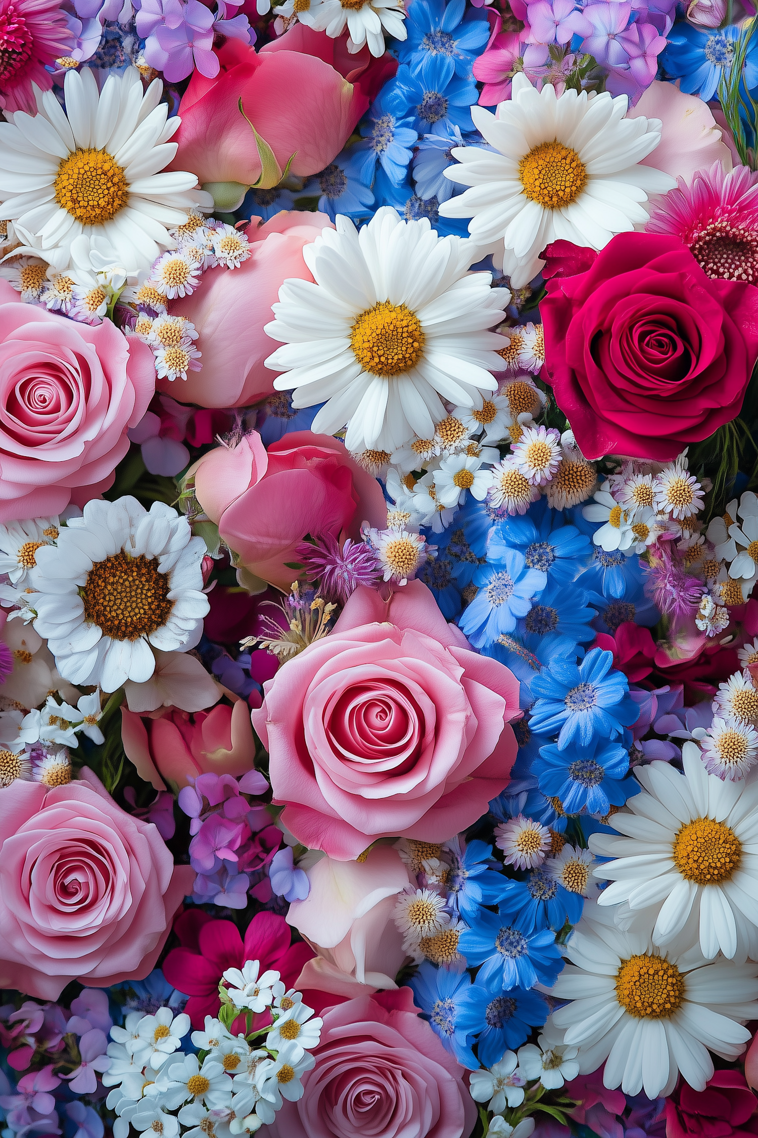 A vibrant floral arrangement with pink roses, white daisies, and blue flowers, creating a colorful and harmonious display.