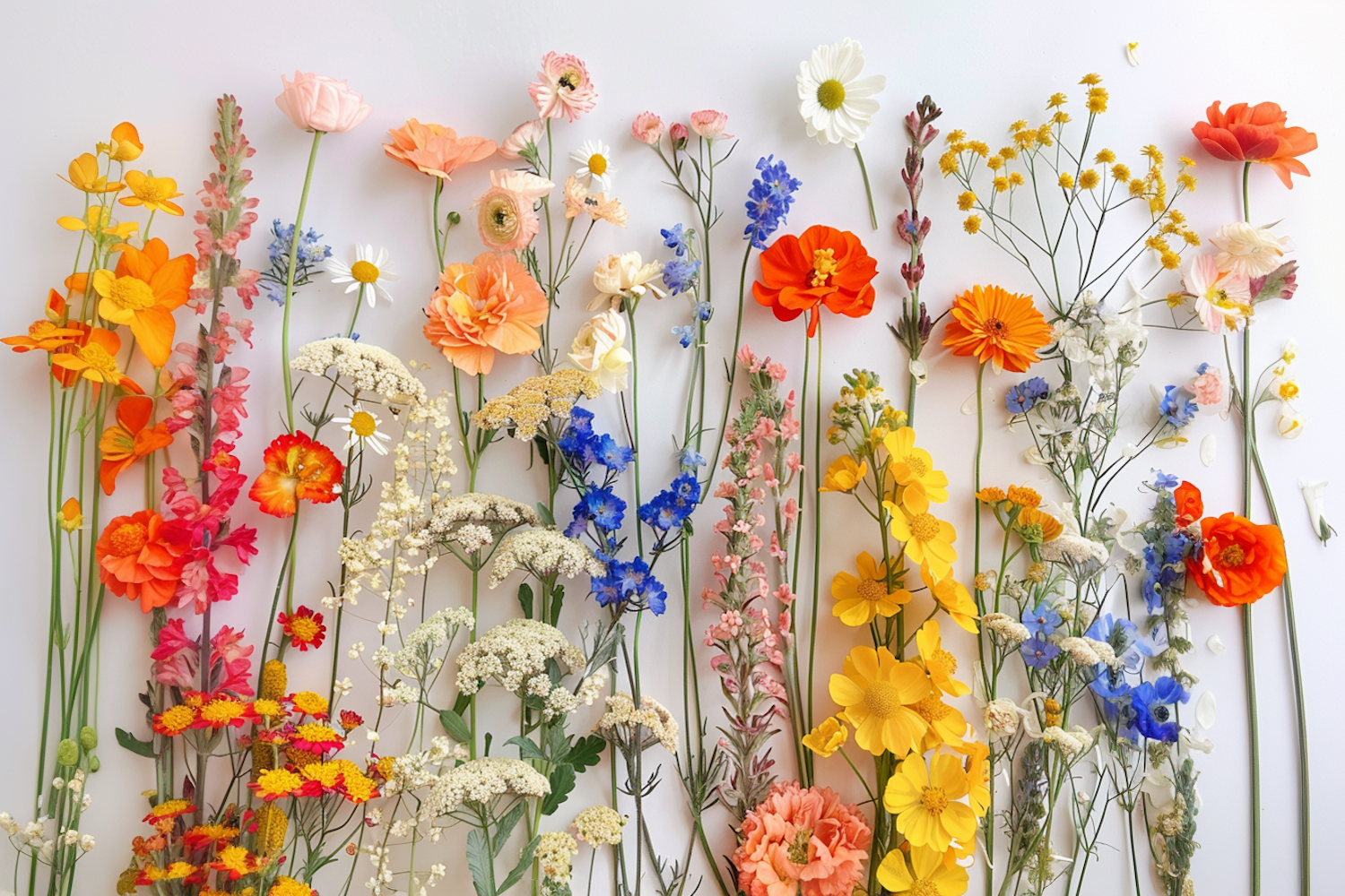 A vibrant floral arrangement with orange, yellow, pink, and blue flowers on a white background, showcasing natural beauty.