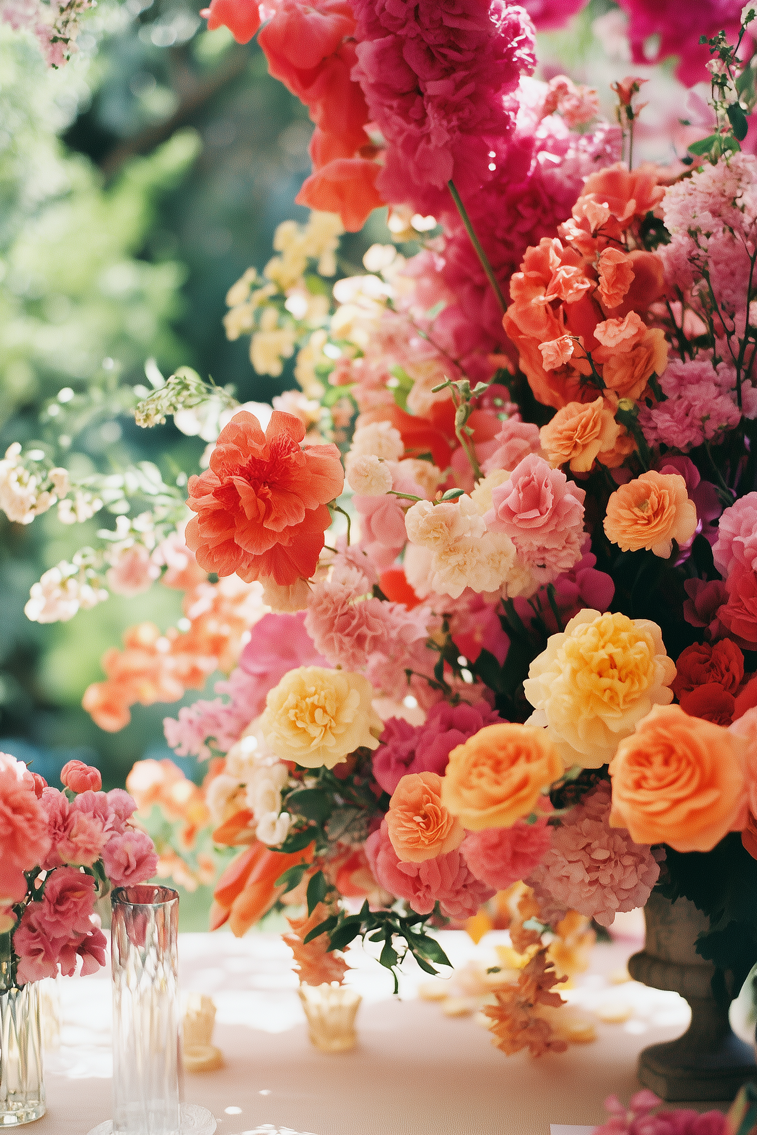 Vibrant floral arrangement with pink, orange, and yellow blooms in glass vases, set against a soft green background.
