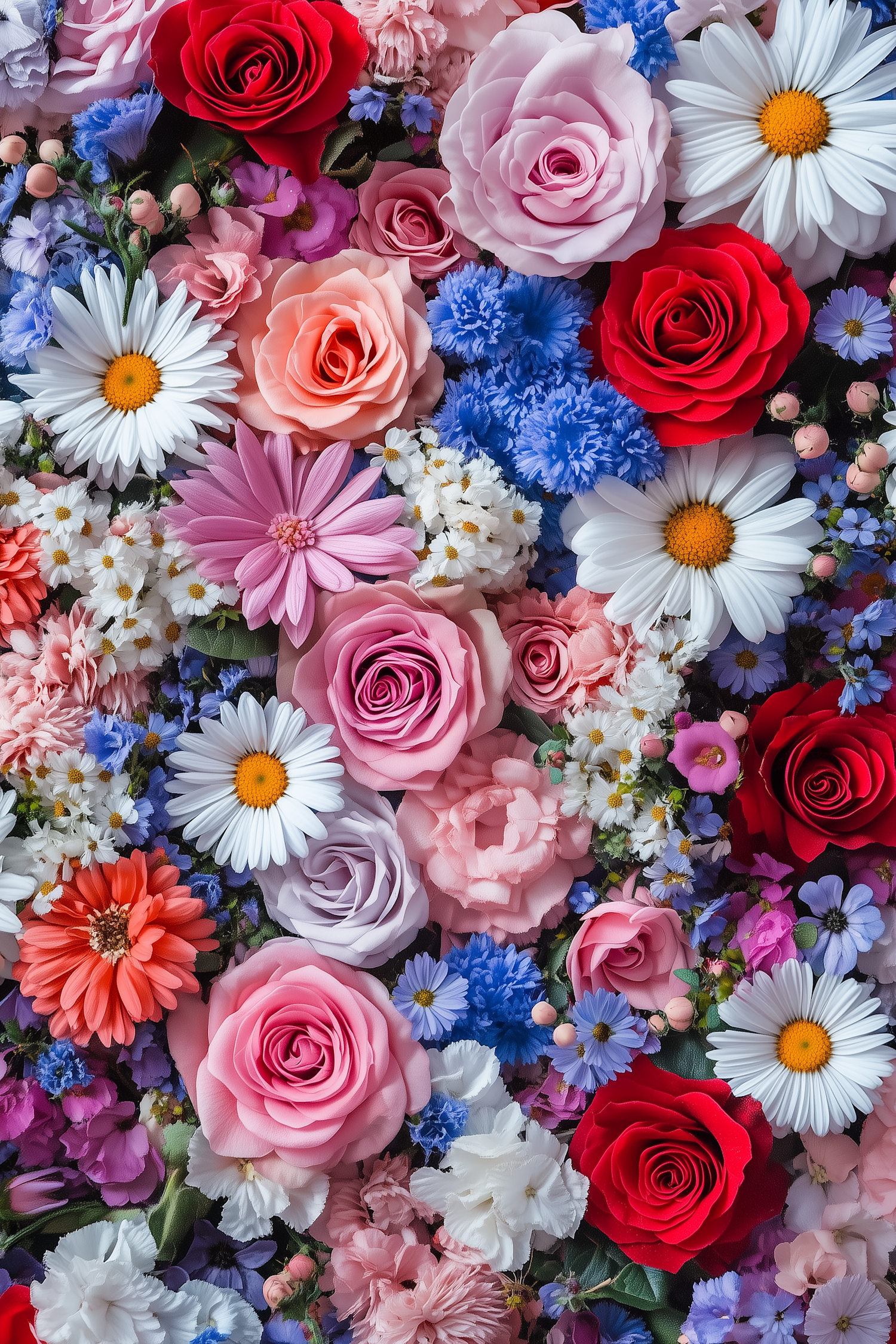 A vibrant floral arrangement with red roses, pink roses, white daisies, and blue cornflowers creating a lush, colorful display.