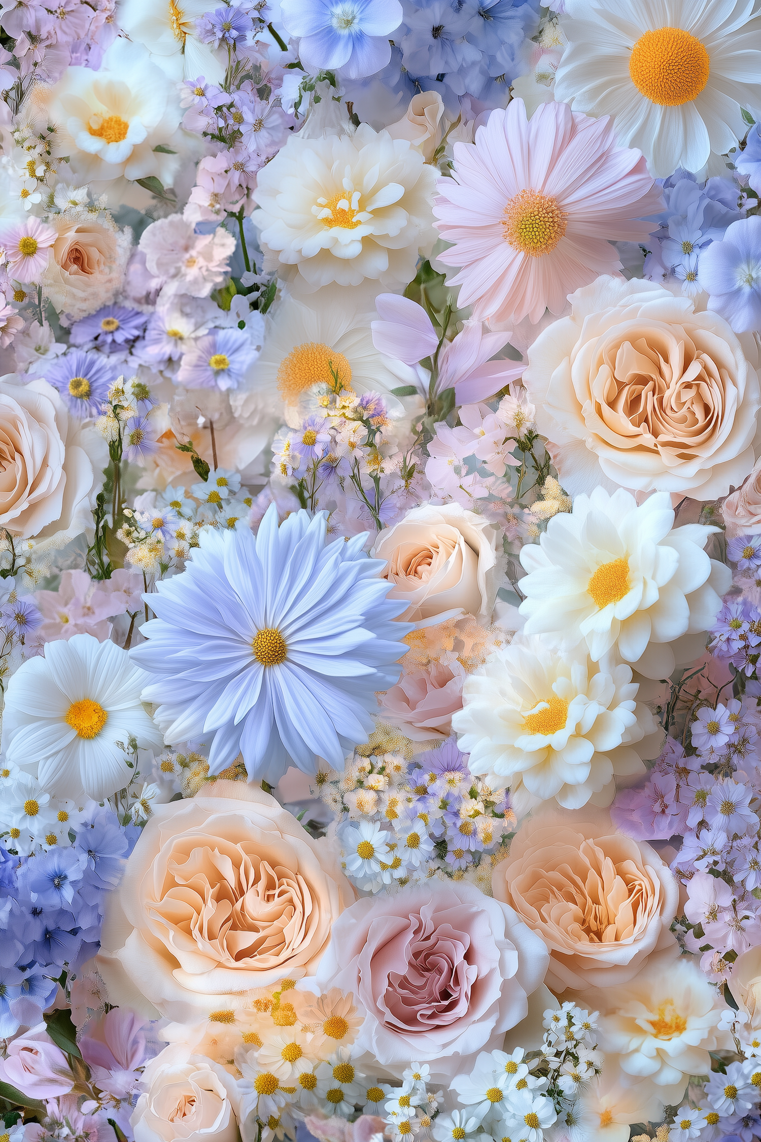 A lush floral arrangement with pastel roses, daisies, and lavender flowers, creating a harmonious and vibrant display.
