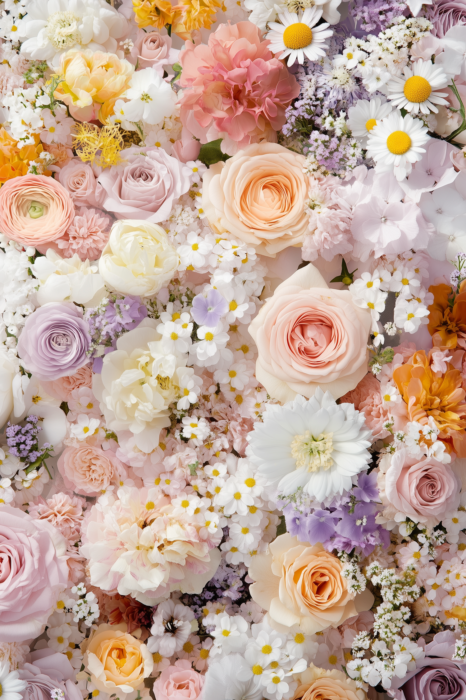 A lush floral arrangement with pink roses, peach ranunculus, white daisies, and lavender blooms, creating a vibrant tapestry of colors.