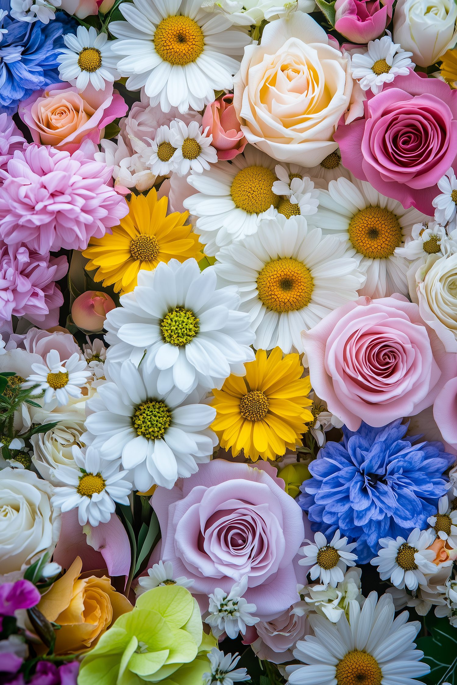 A vibrant floral arrangement featuring pink roses, white and yellow daisies, and blue chrysanthemums in a lush, colorful display.