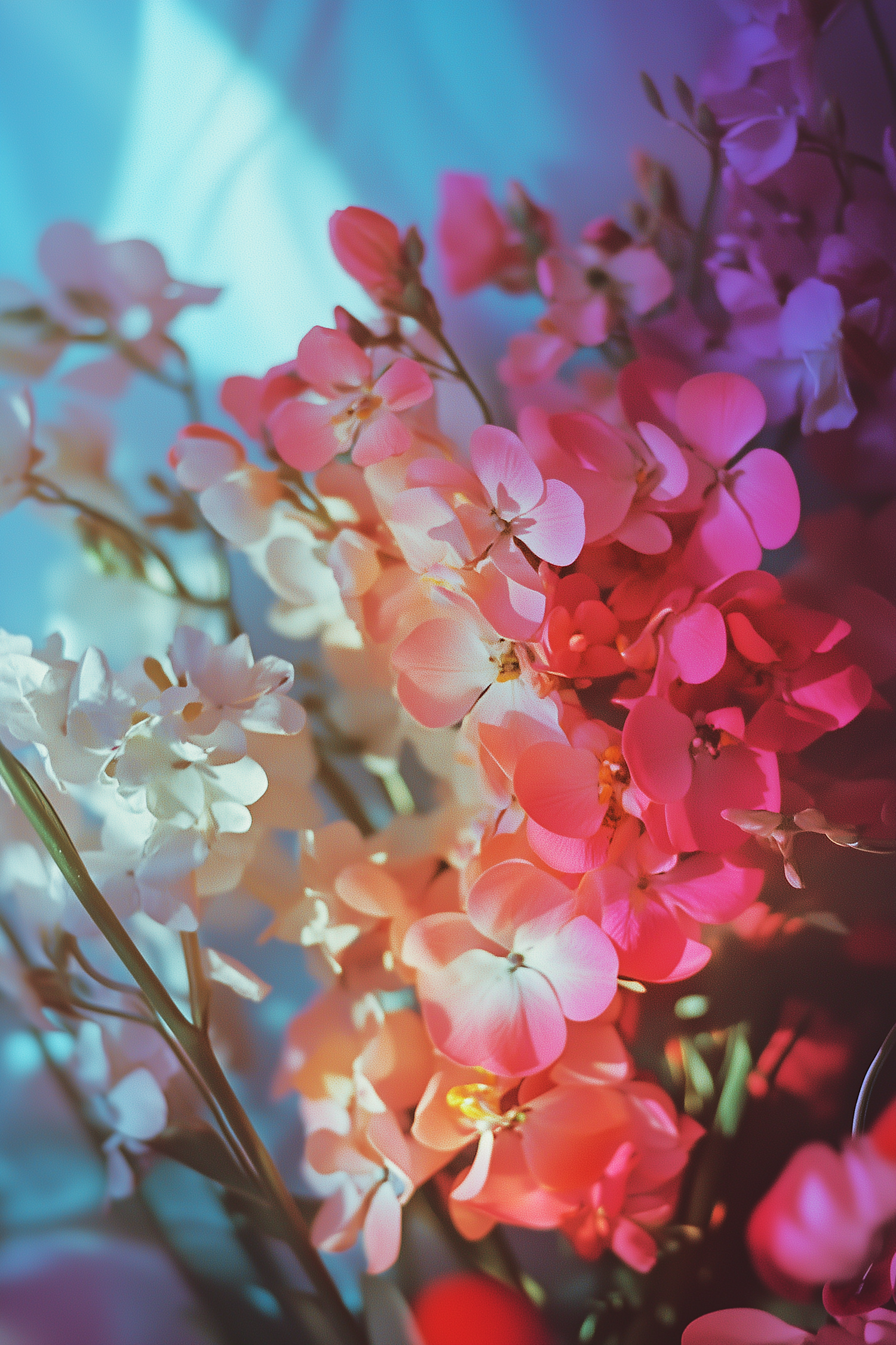 Vibrant bouquet of pink, white, and purple flowers with soft lighting and a dreamy background.