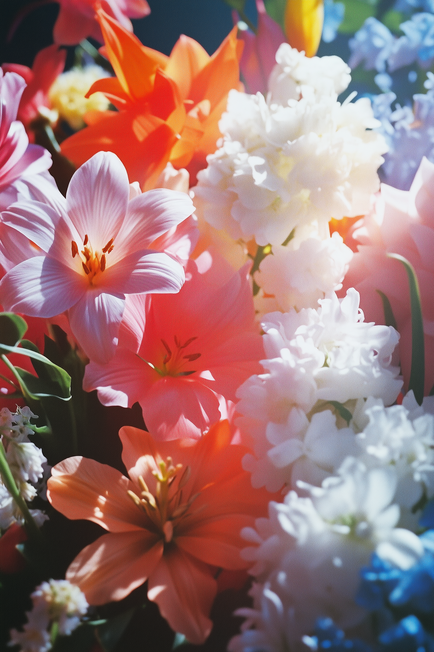 A vibrant bouquet of pink lilies and white hydrangeas in soft natural light, creating a fresh and lively floral scene.