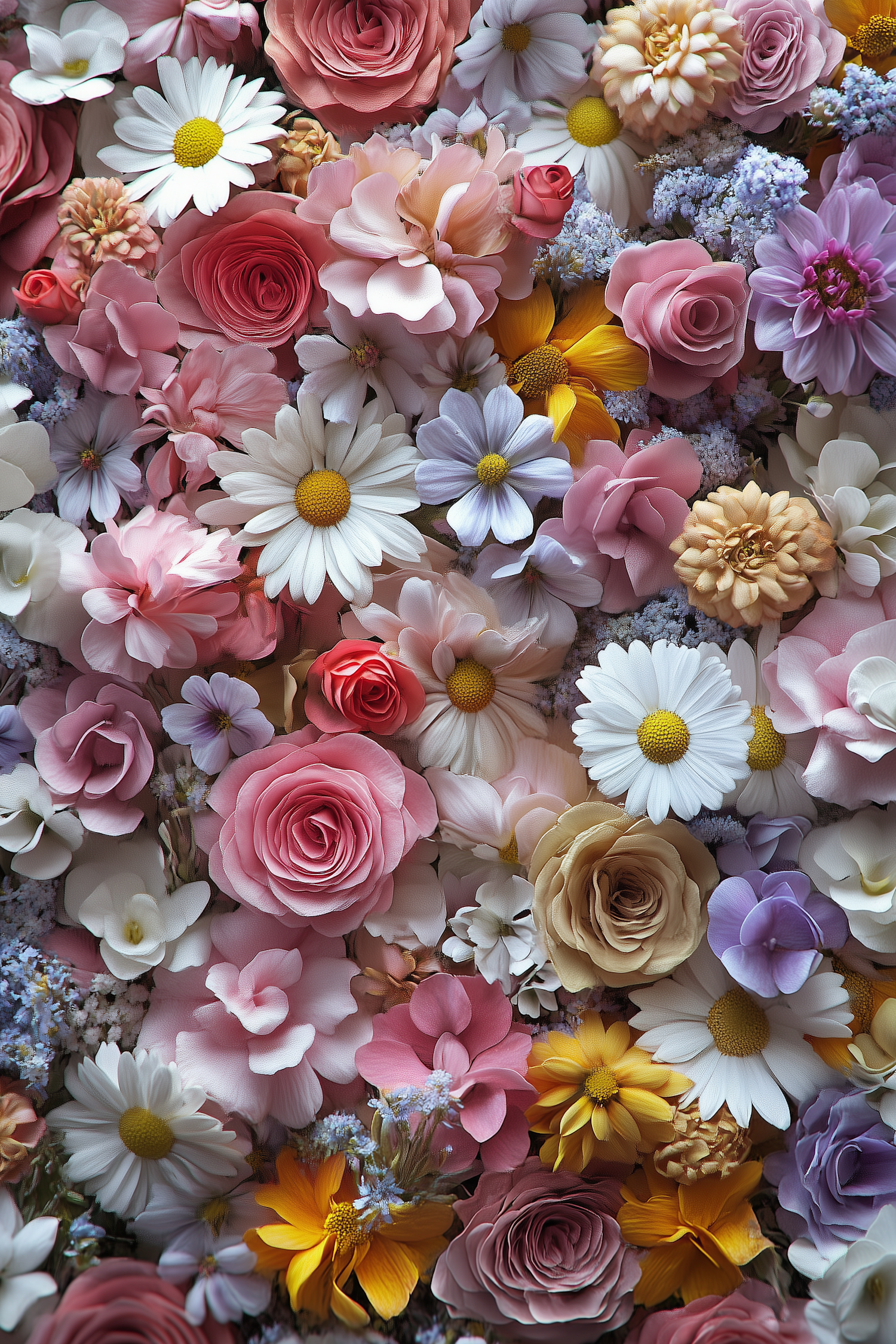 A stunning floral arrangement with pink roses, white daisies, and vibrant marigolds, creating a colorful and lush tapestry of blooms.