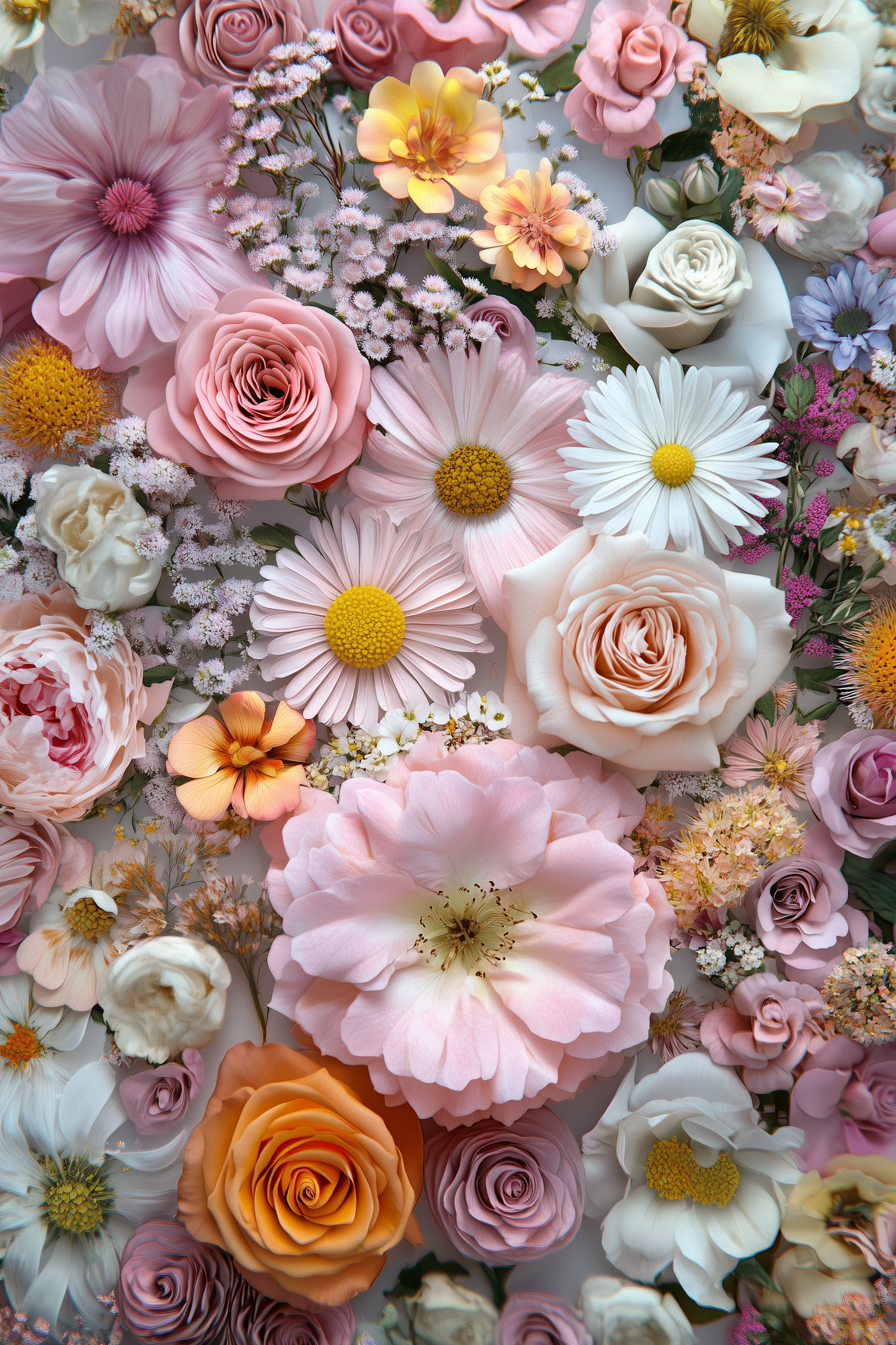 A lush floral arrangement with pink roses, white daisies, and pastel blooms, creating a vibrant and elegant garden display.