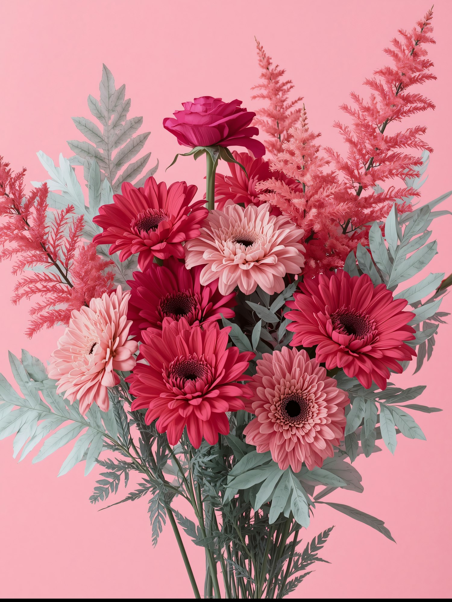 A stunning bouquet of red and pink flowers with green foliage, set against a soft pink background, creating a vibrant and elegant display.