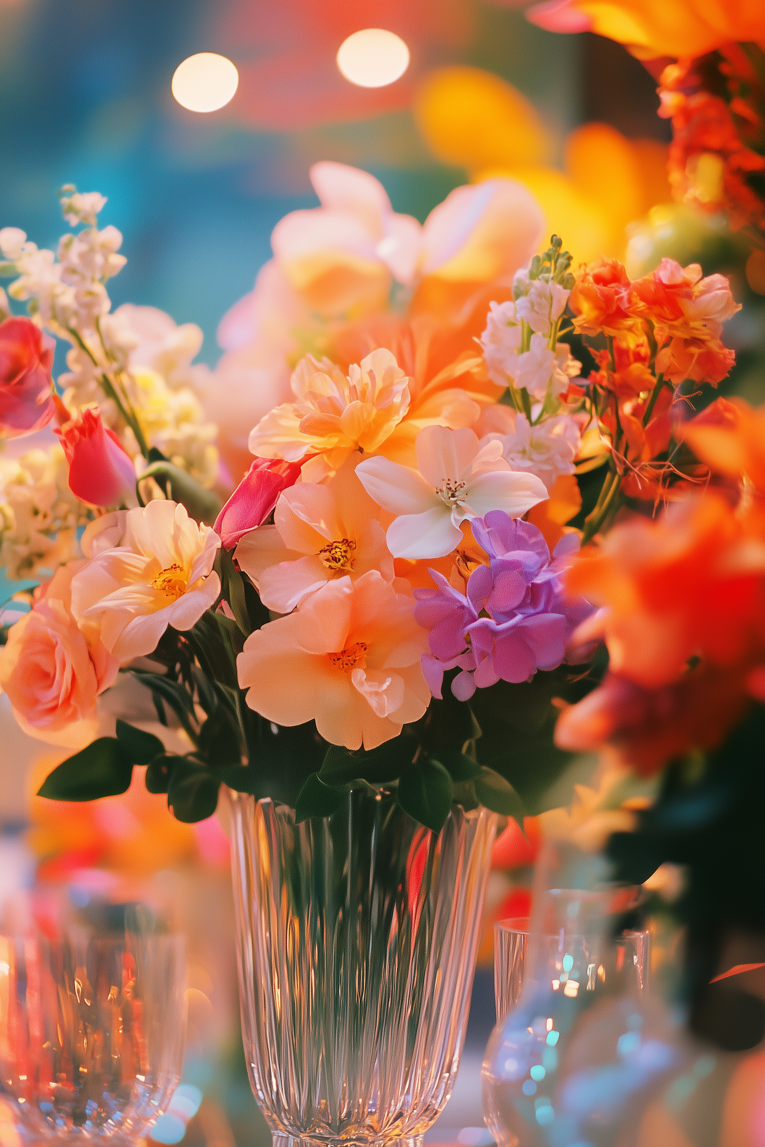 Vibrant bouquet of orange, pink, and purple flowers in a glass vase with warm bokeh lights in the background.