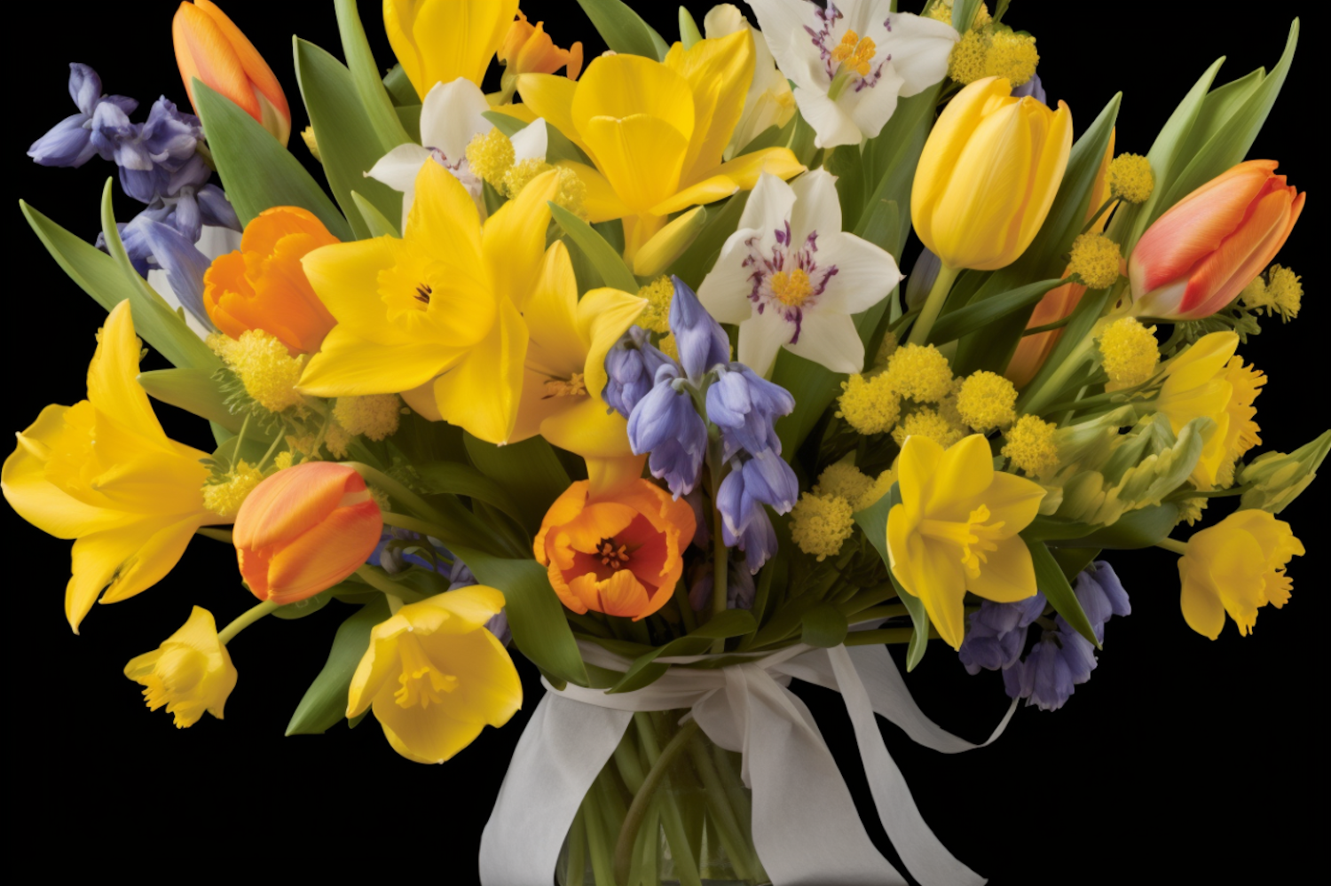 Bright spring bouquet with yellow daffodils, orange tulips, white lilies, and blue hyacinths tied with a white ribbon.